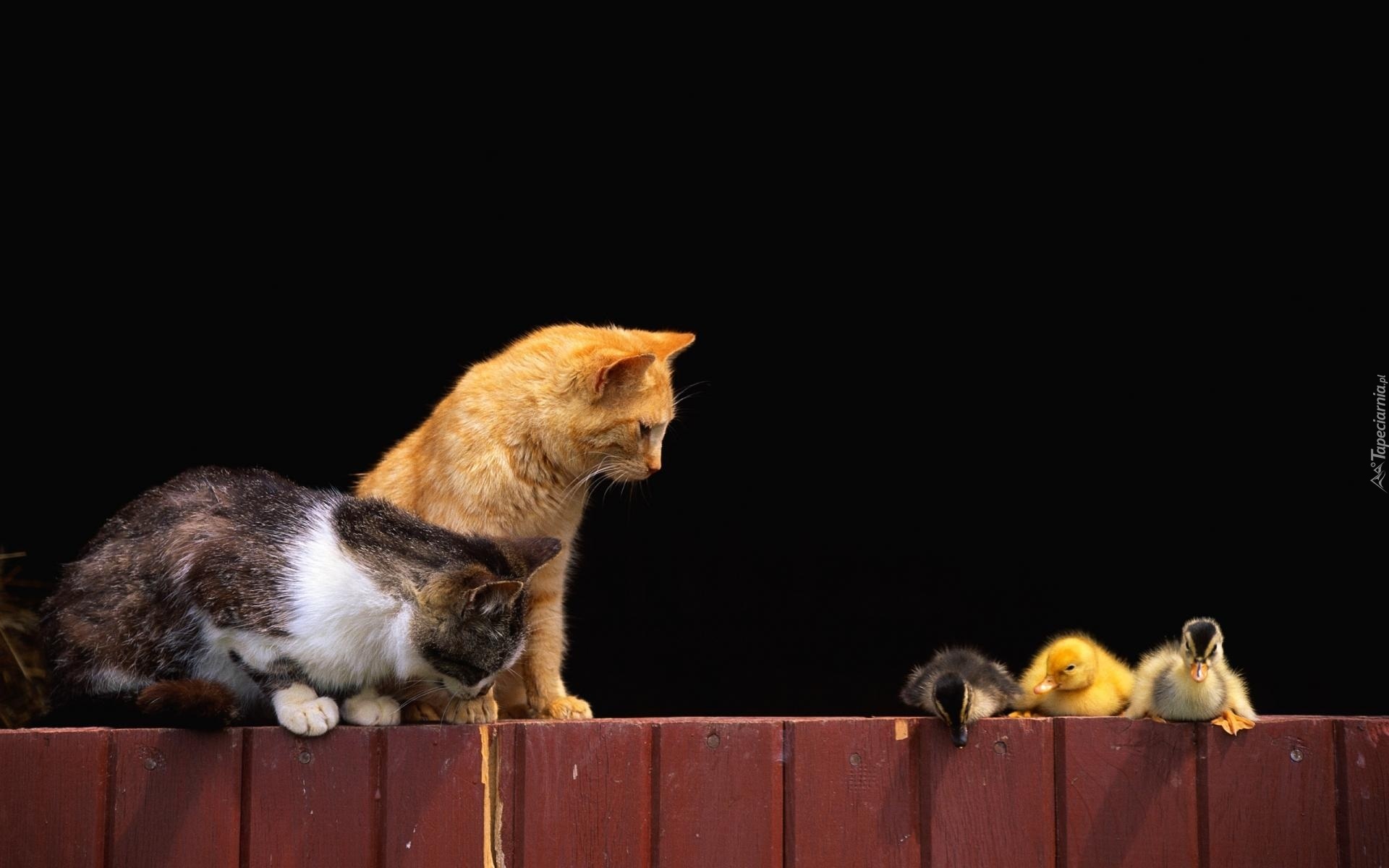 Edytor tapety: Koty, Kaczątka, Płot, Czarne, Tło