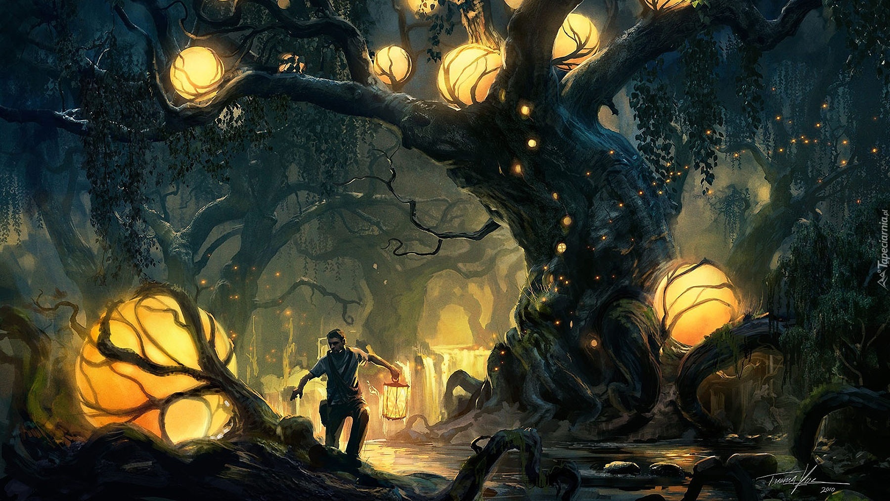 Edytor tapety: Fantasy, Las, Korzenie, Drzew, Chłopak, Lampion, Światła