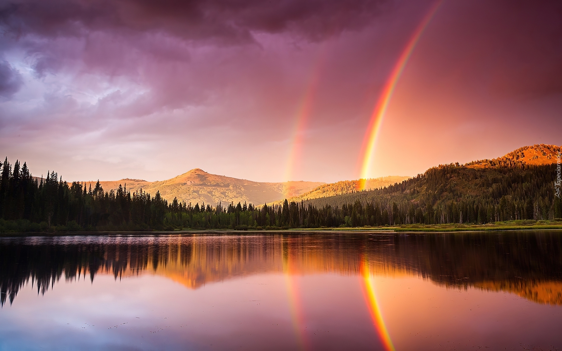 Edytor tapety: Góry, Las, Las, Jezioro, Tęcza