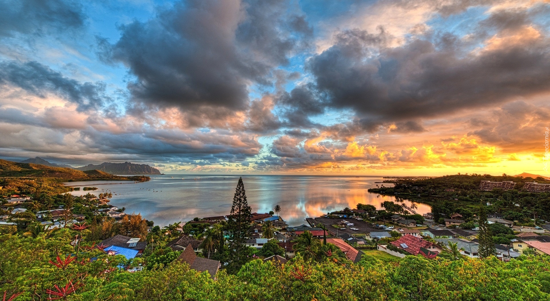 Edytor tapety: Zachód, Słońca, Chmury, Morze, Brzeg, Domki