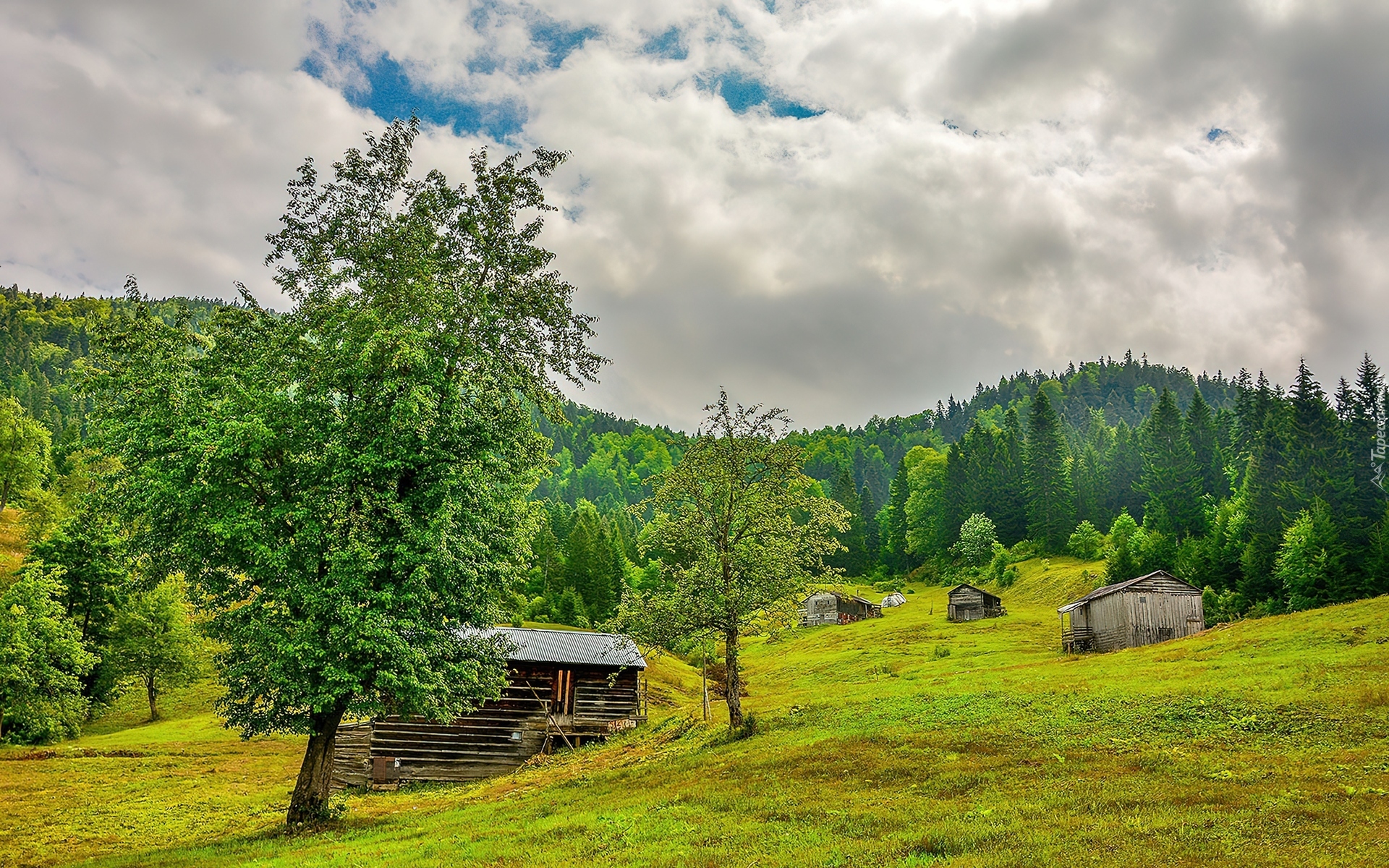 Edytor tapety: Lato, Las, Wieś, Pola, Domki, Domy, Drzewa