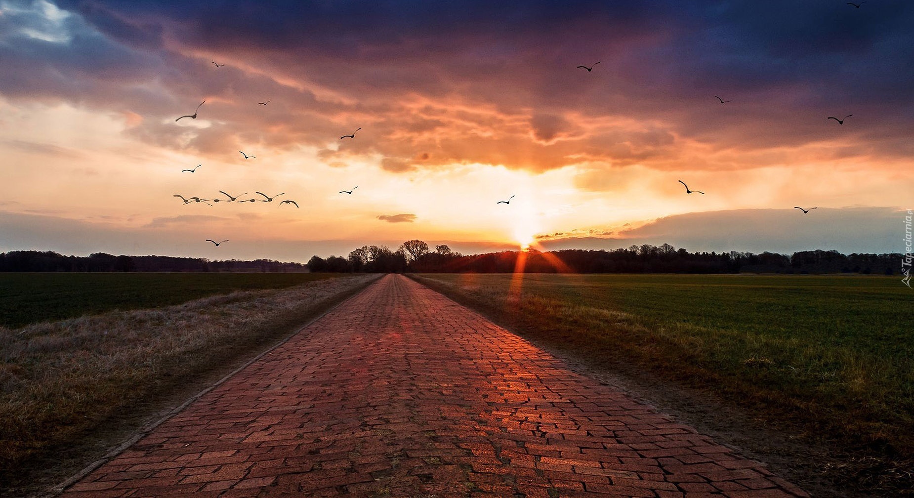 Edytor tapety: Zachód, Słońca, Droga, Las, Ptaki