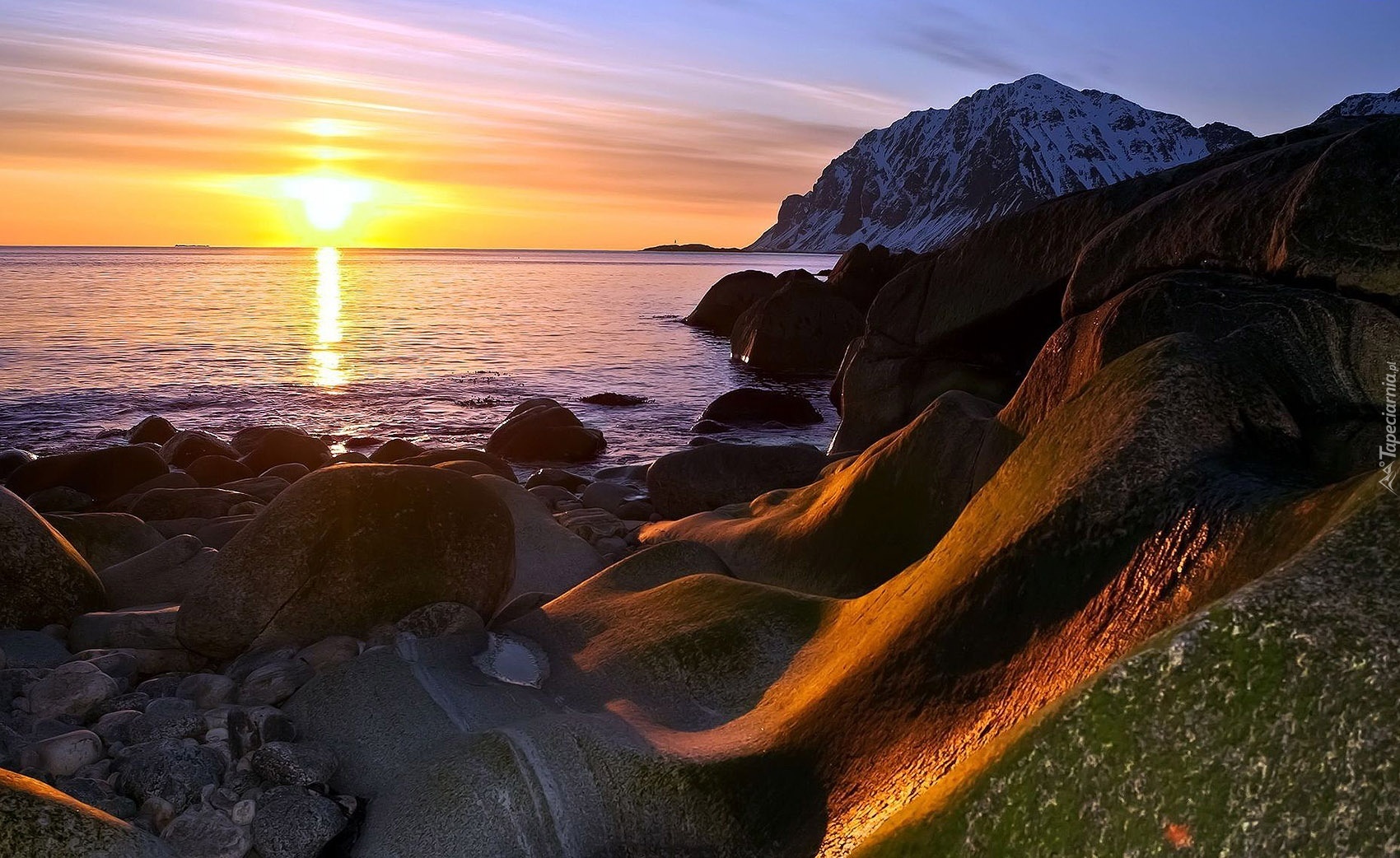 Edytor tapety: Zachód, Słońca, Morze, Kamienie, Skały, Góry