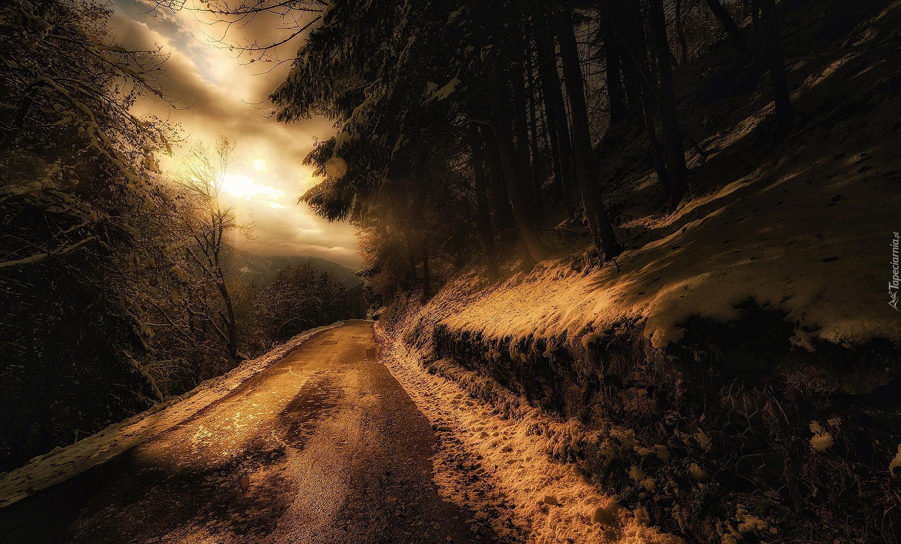 Edytor tapety: Zachód, Słońca, Droga, Skarpa, Drzewa, Zima, Śnieg