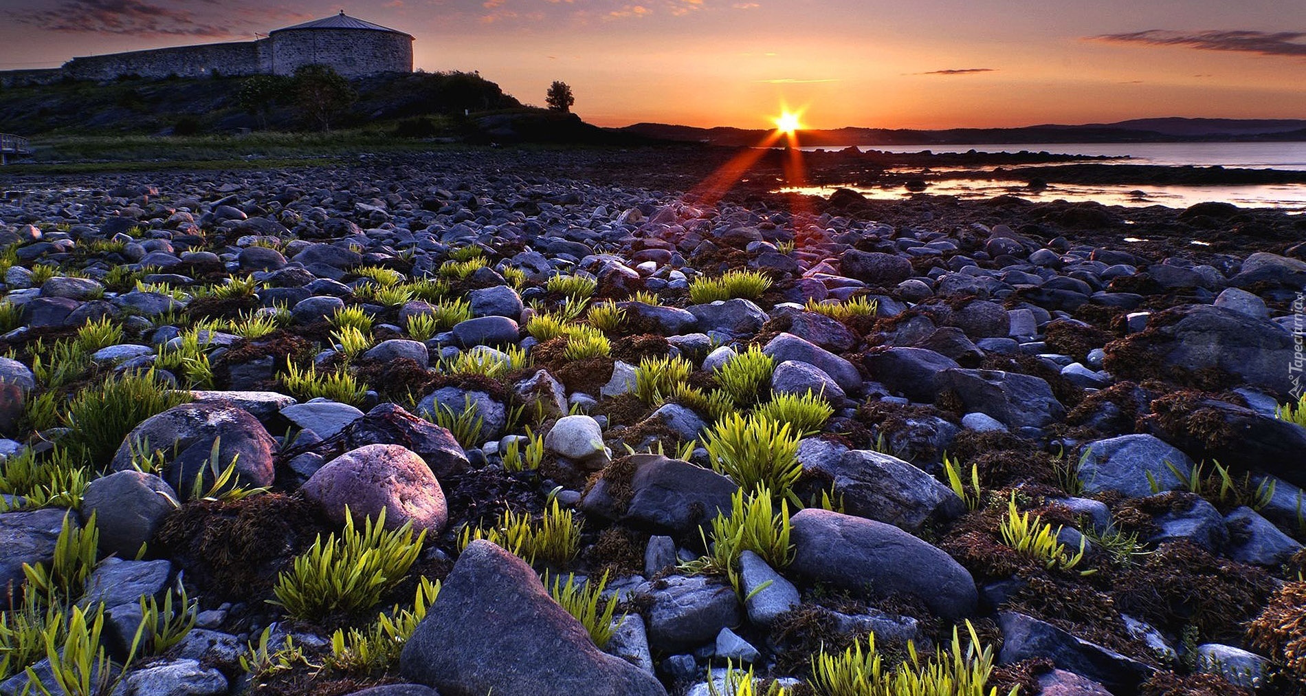 Edytor tapety: Zachód, Słońca, Morze, Brzeg, Dom, Kamienie, Trawa, Kępki