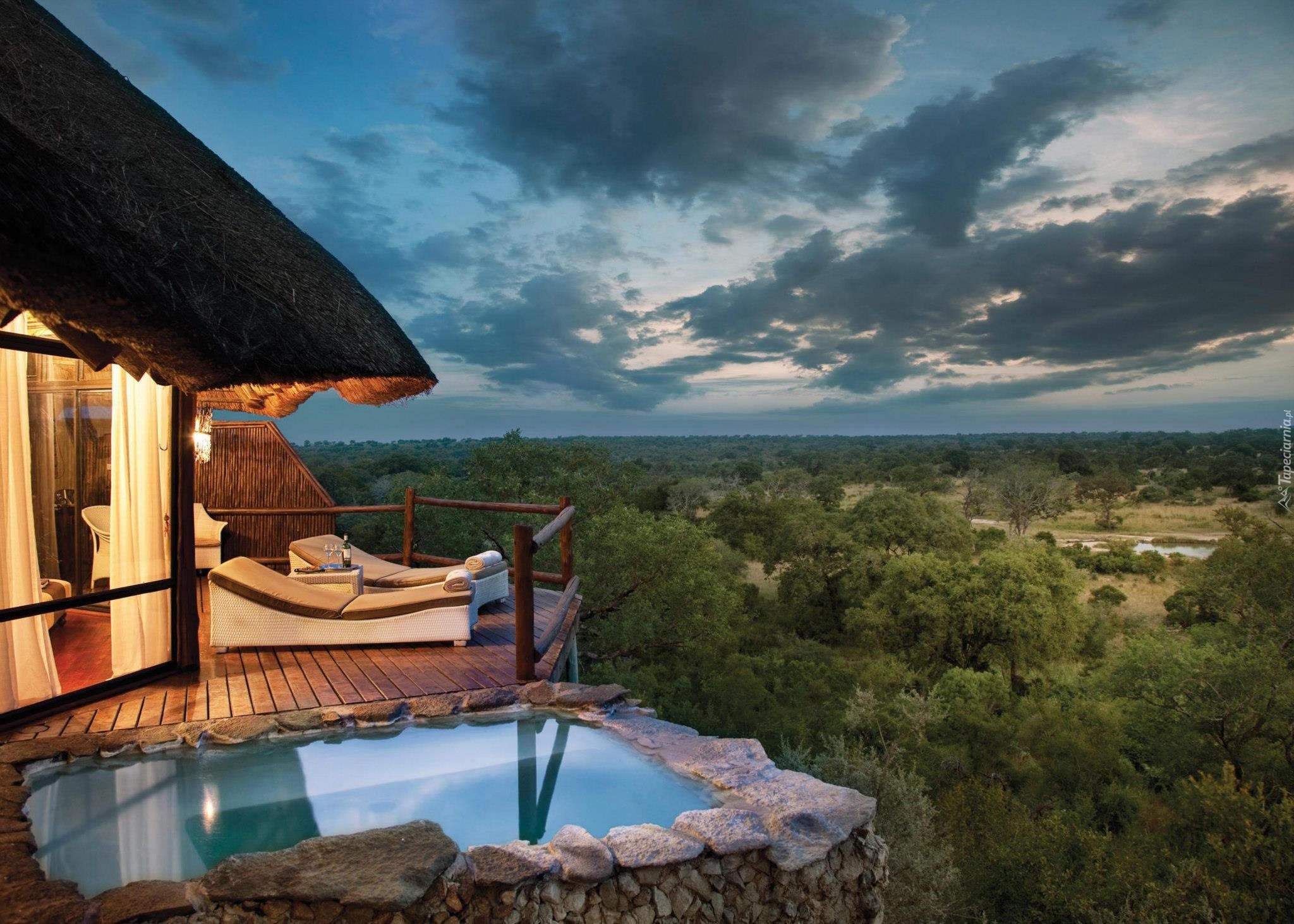 Edytor tapety: Dom, Basen, Lasy, Chmury