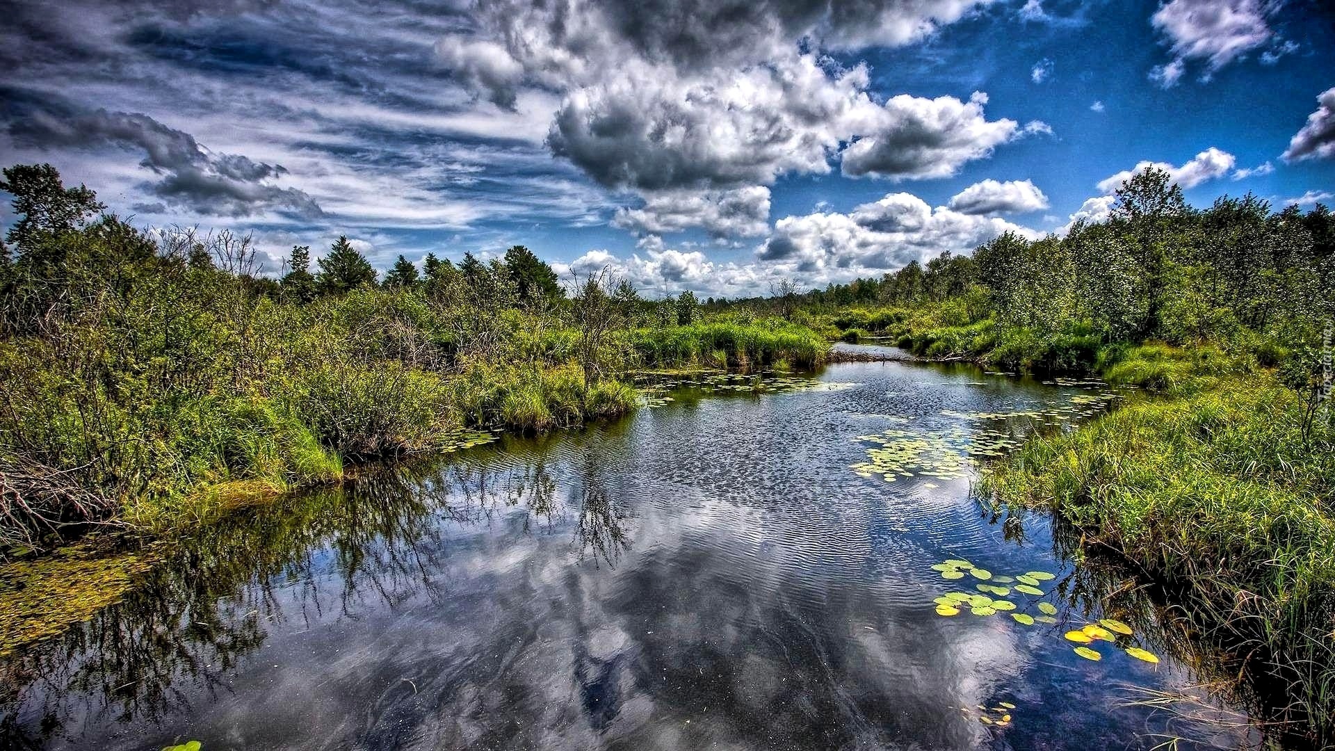 Edytor tapety: Rzeka, Chmury, Lasy