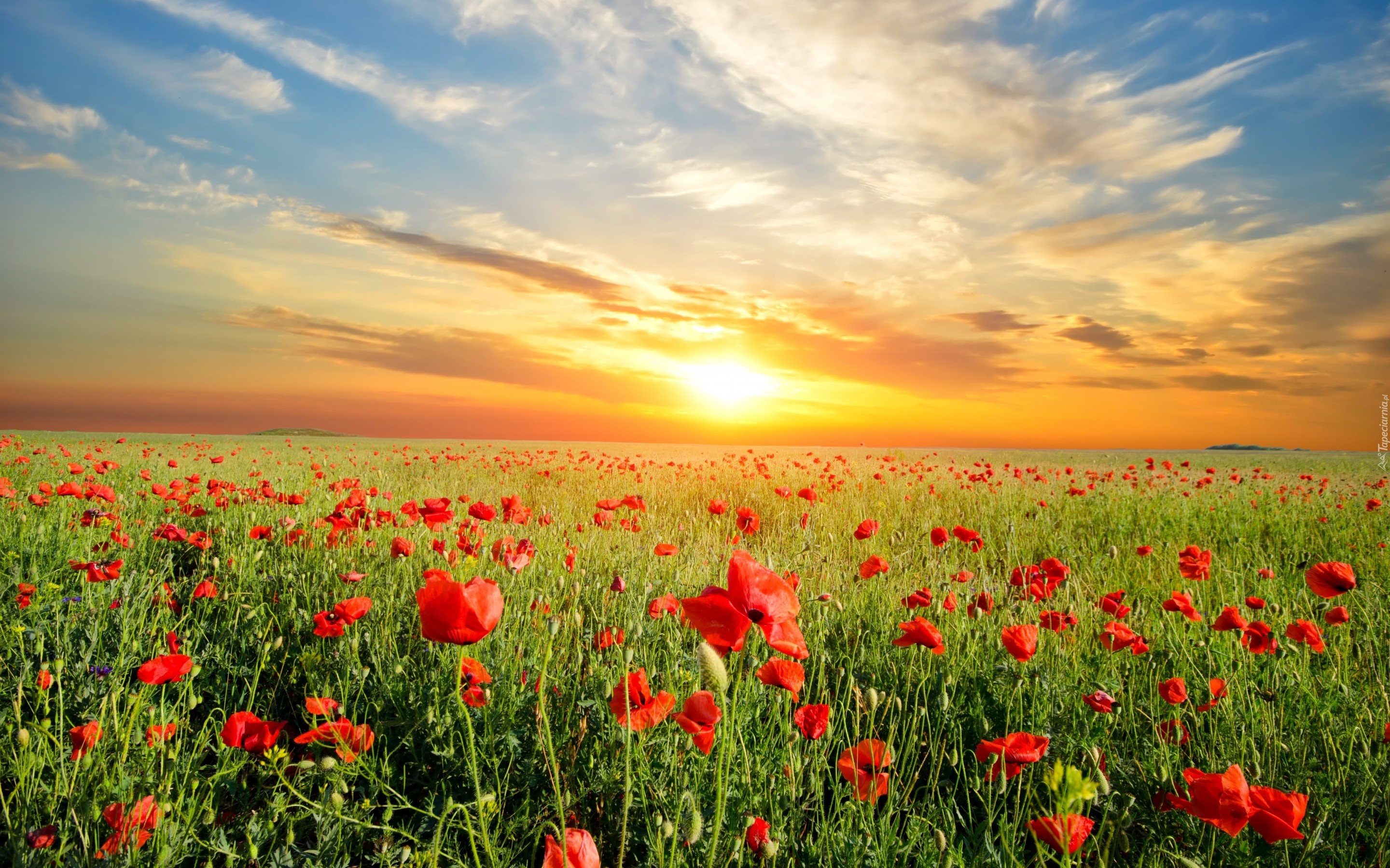Edytor tapety: Zachód, Słońca, Łąka, Maki