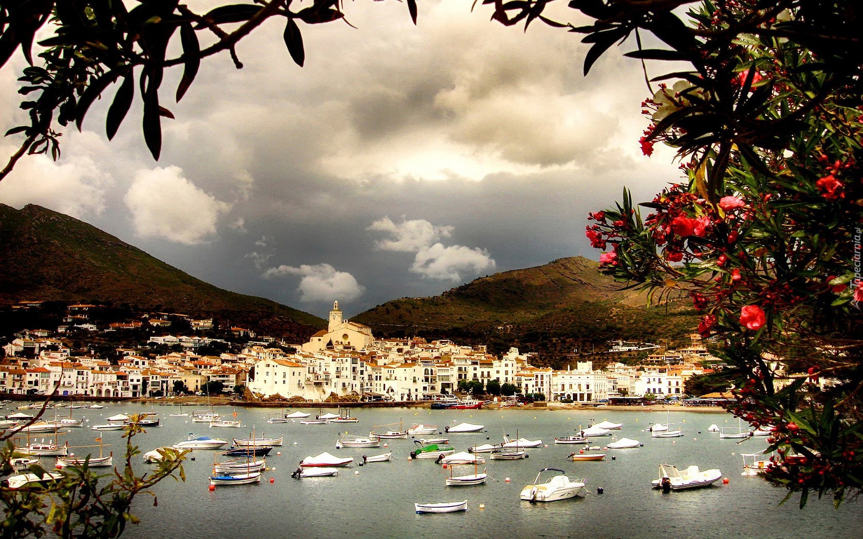 Edytor tapety: Góry, Jezioro, Miasteczko, Motorówki