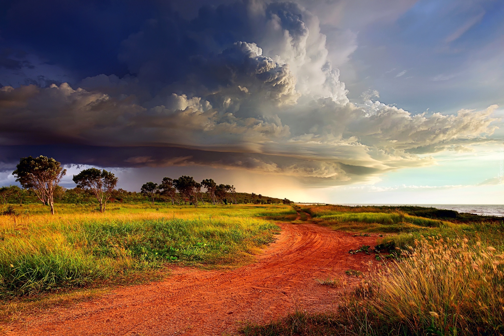 Edytor tapety: Chmury, Droga, Drzewa, Łąka