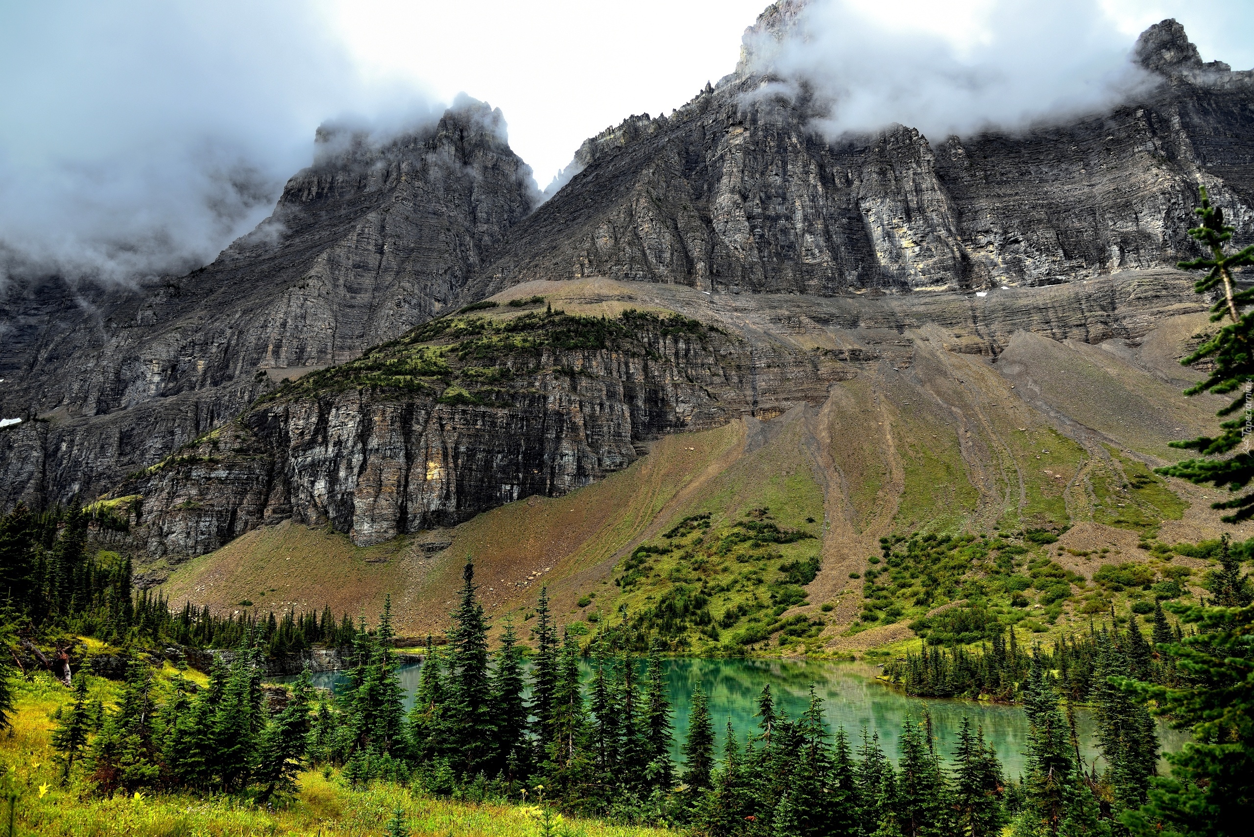 Edytor tapety: Skały, Mgła, Świerki