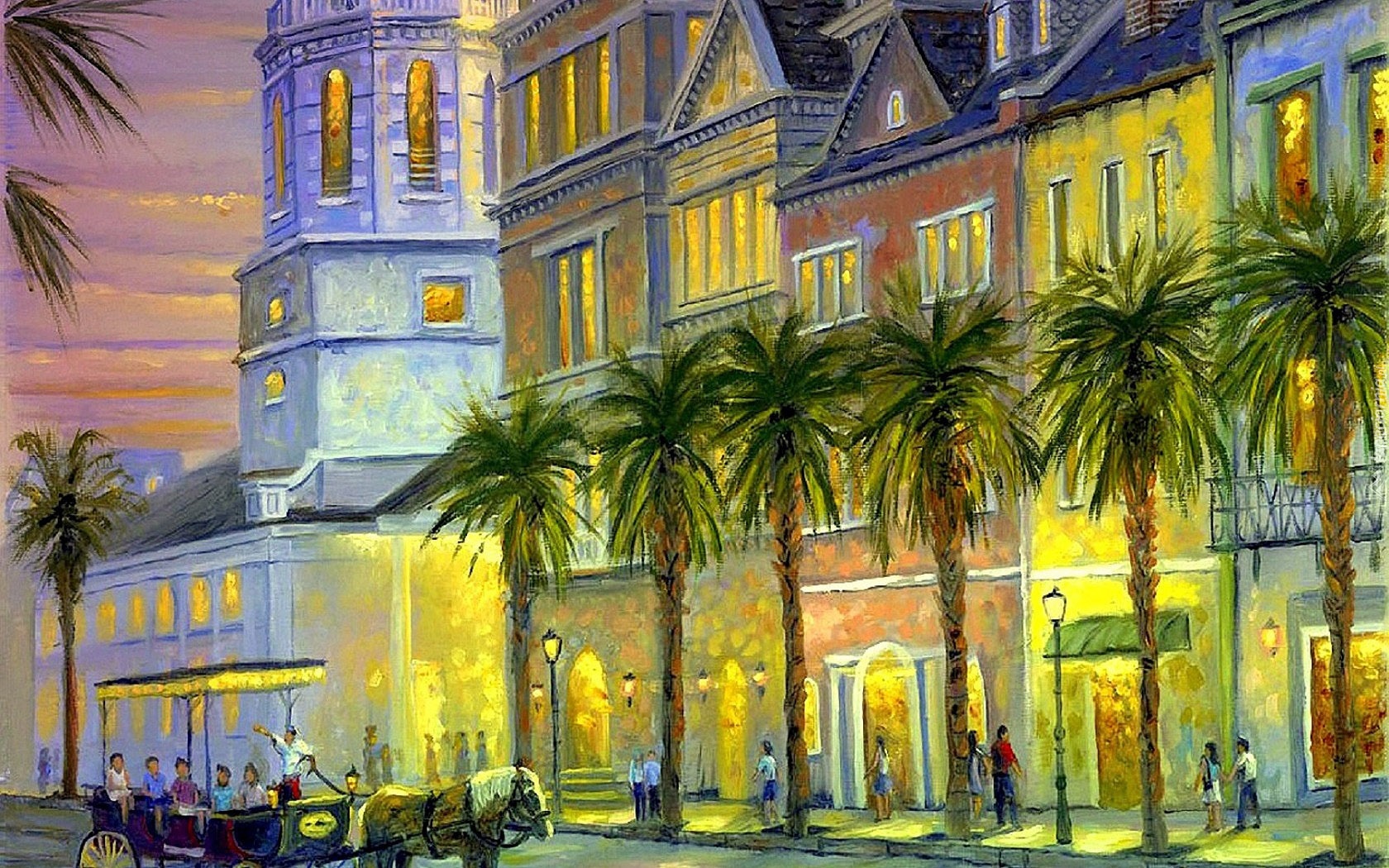 Edytor tapety: Malarstwo, Obraz, Ulica, Domy, Przechodnie, Dorożka, Koń, Palmy