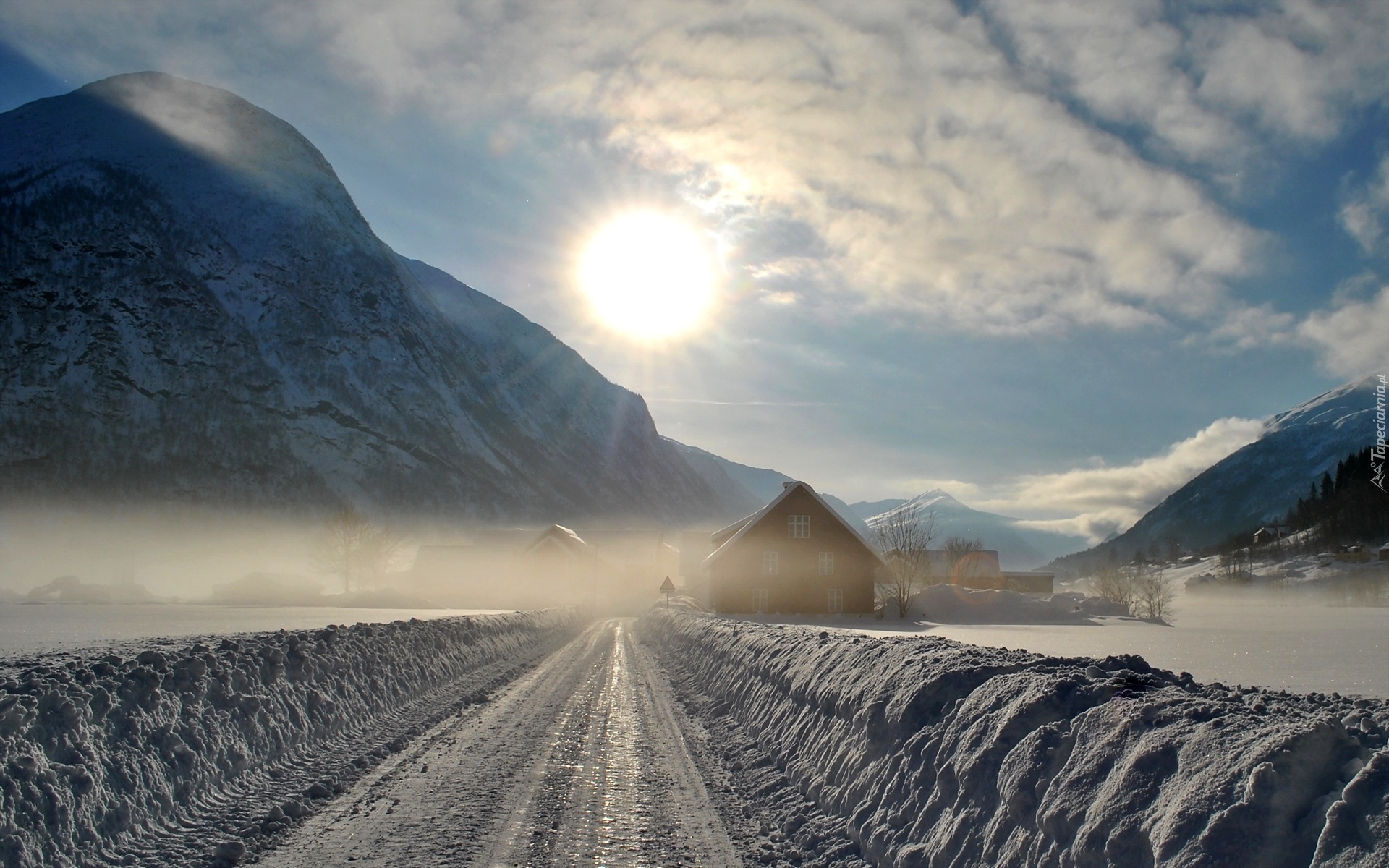 Edytor tapety: Droga, Śnieg, Góry, Słońca, Mgła