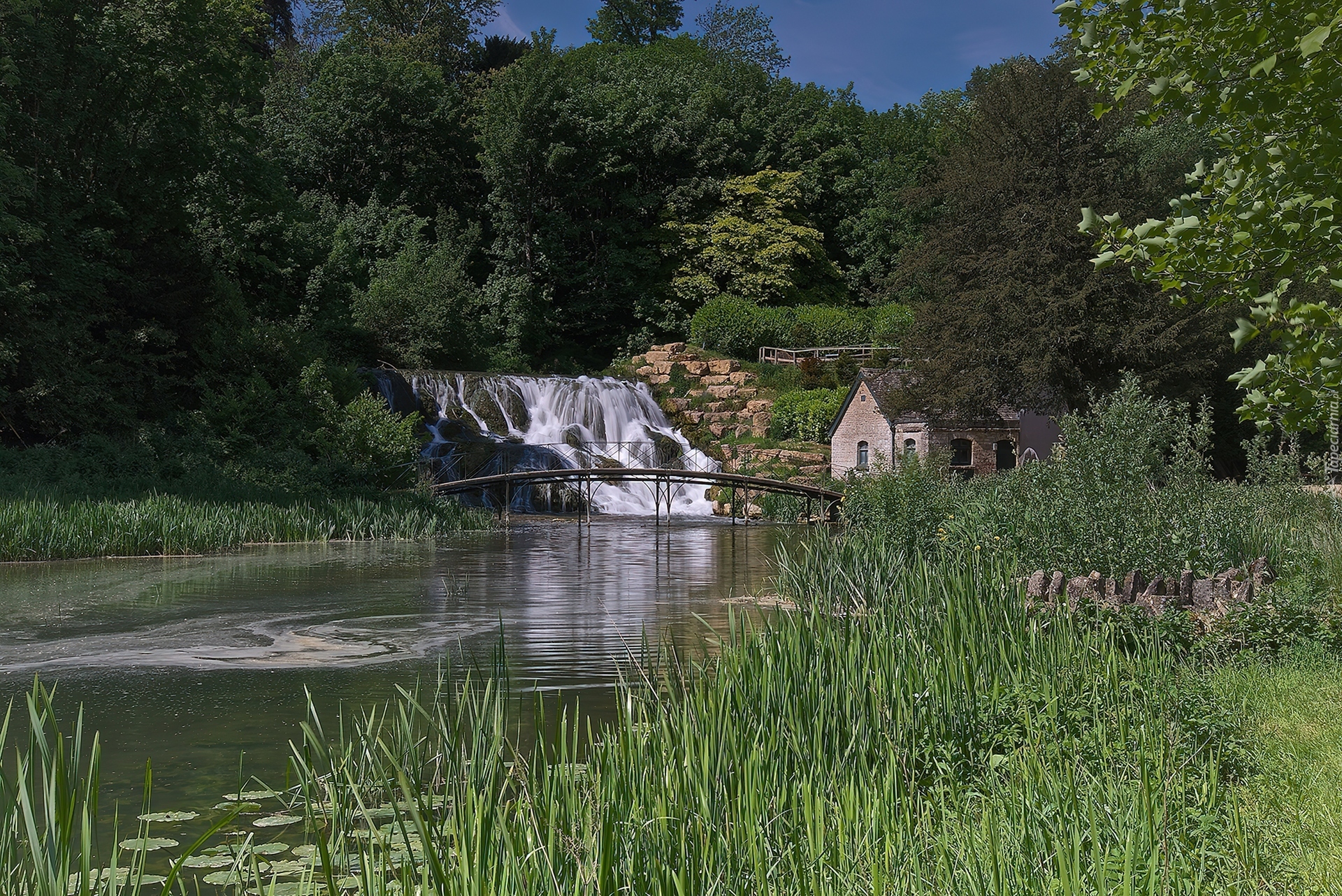 Edytor tapety: Rzeka, Wodospad, Las, Kamienie, Dom, Most, Mostek