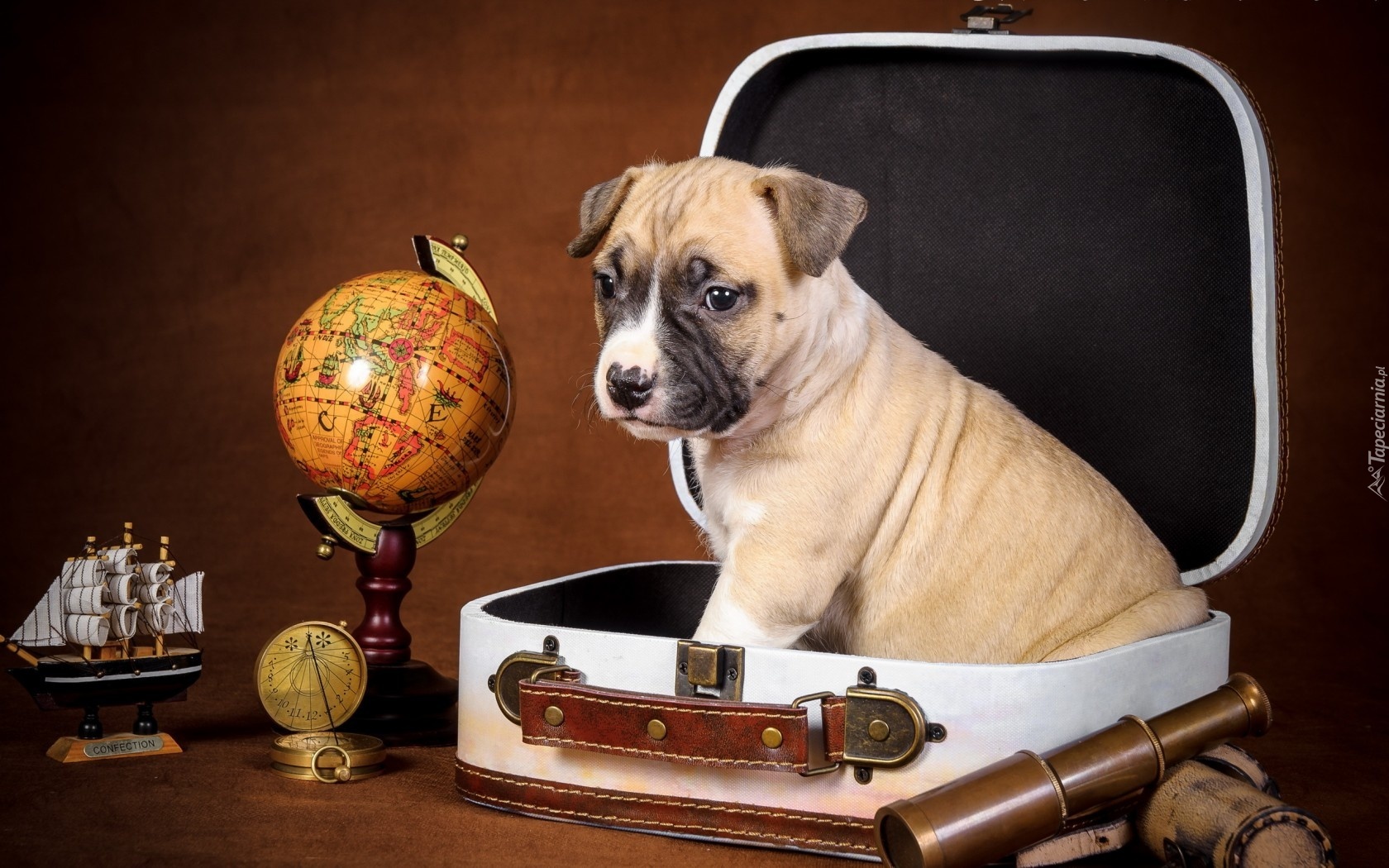 Edytor tapety: Szczeniak, Walizka, Zabawki, Globus, Słodkie Zwierzęta