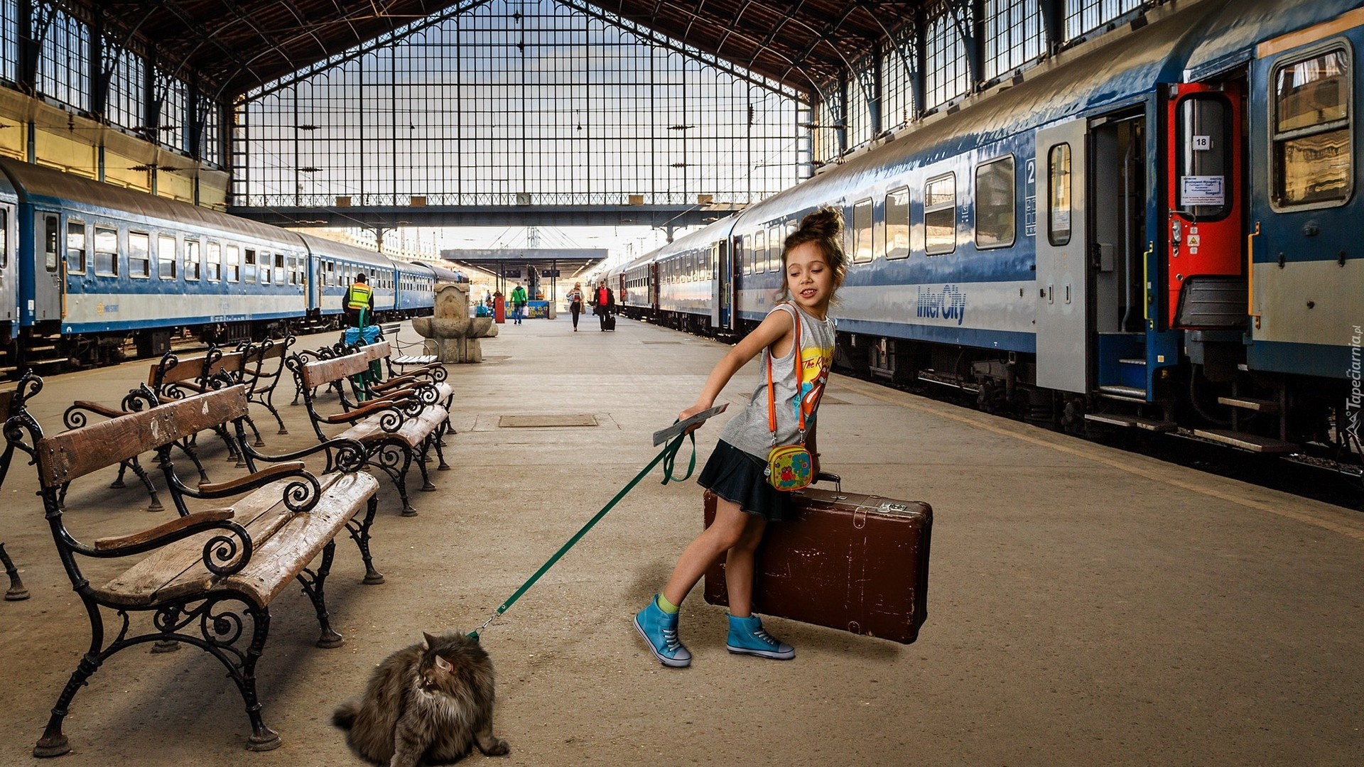 Edytor tapety: Pociągi, Peron, Dziewczynka, Kot, Walizka, Ławki, Smycz