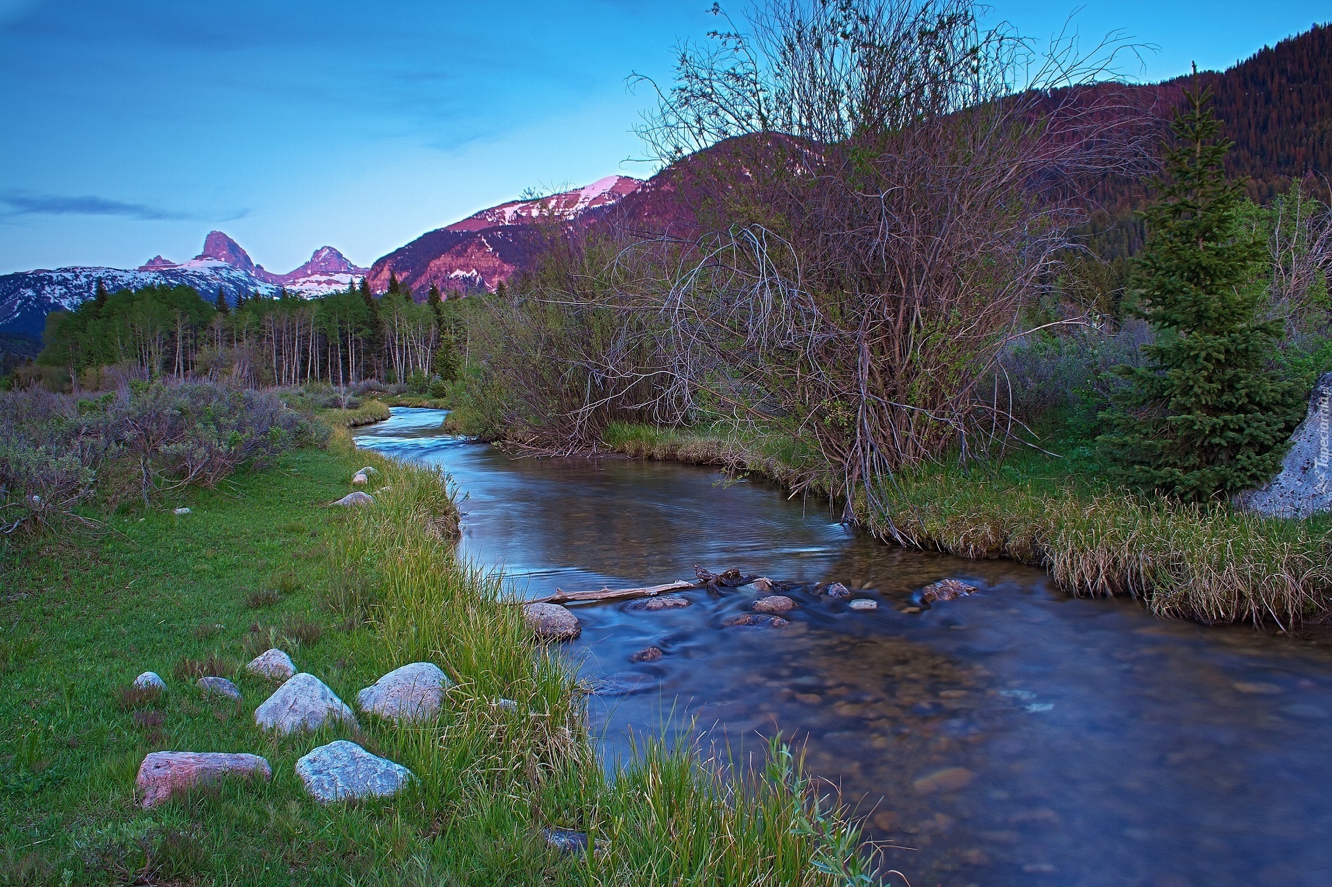 Edytor tapety: rzeka, Góry, Trawa, Drzewa, Kamienie