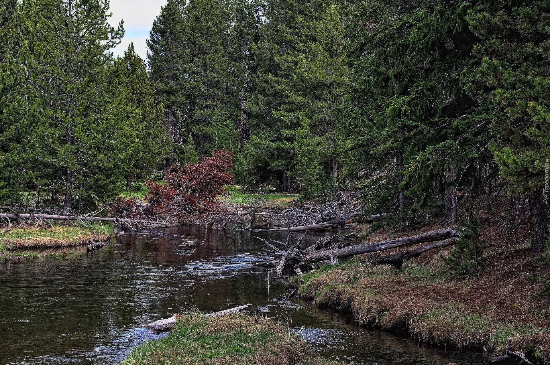 Edytor tapety: Las, Rzeka. Powalone, Drzewa
