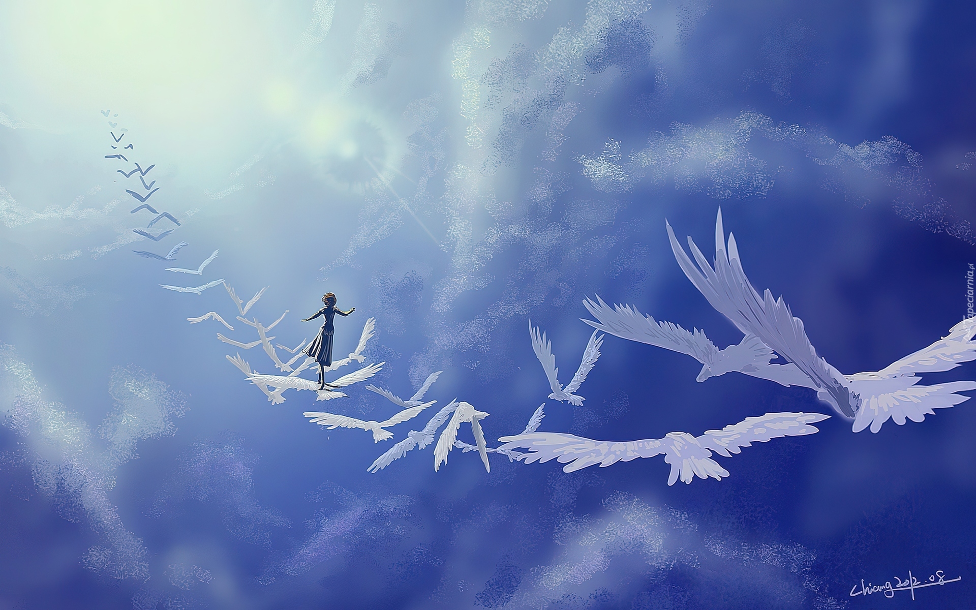 Edytor tapety: Grafika, Niebo, Schody, Dziewczyna, Ptaki