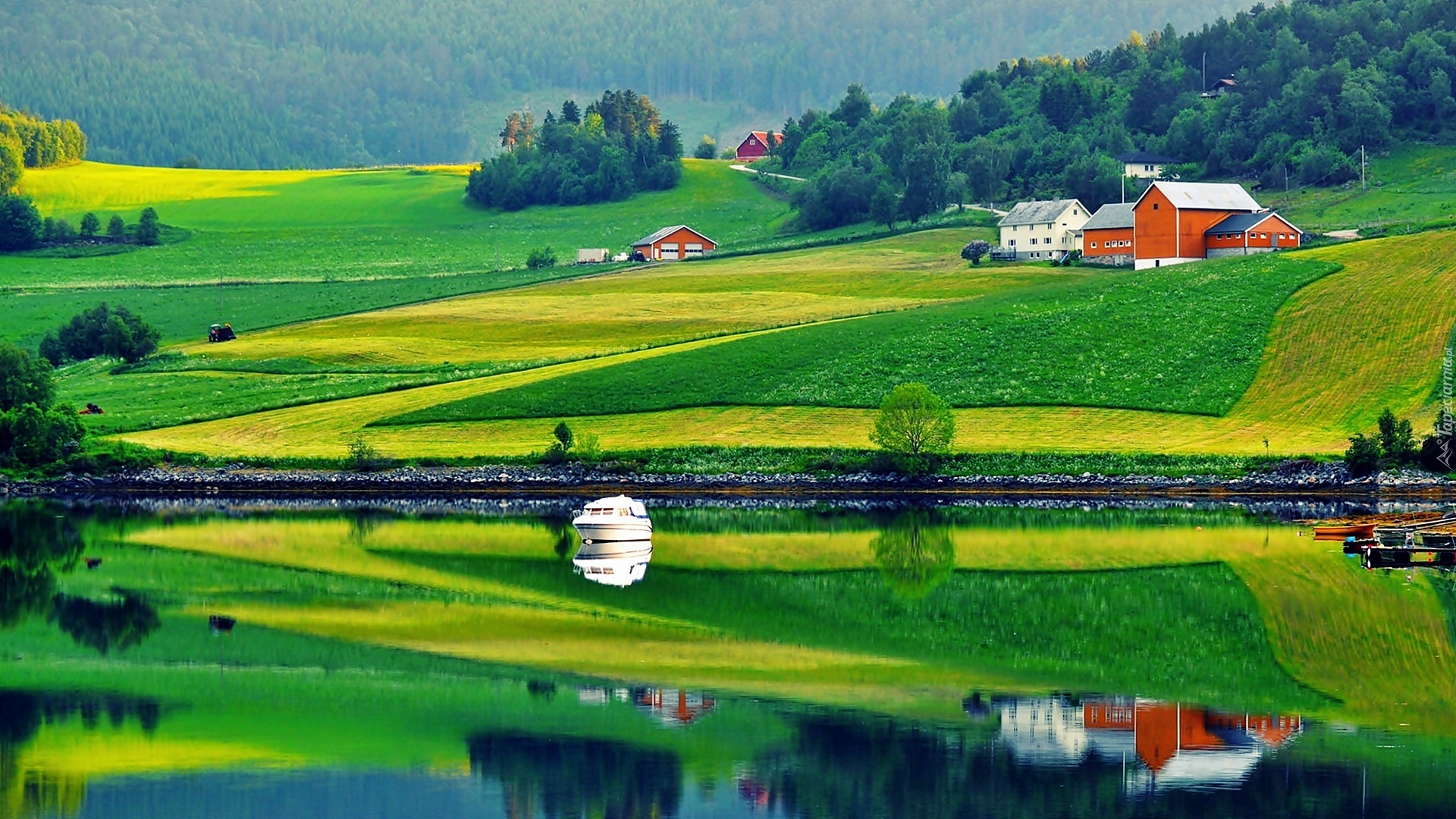 Edytor tapety: Pola, Domy, Rzeka, Jacht, Odbicie