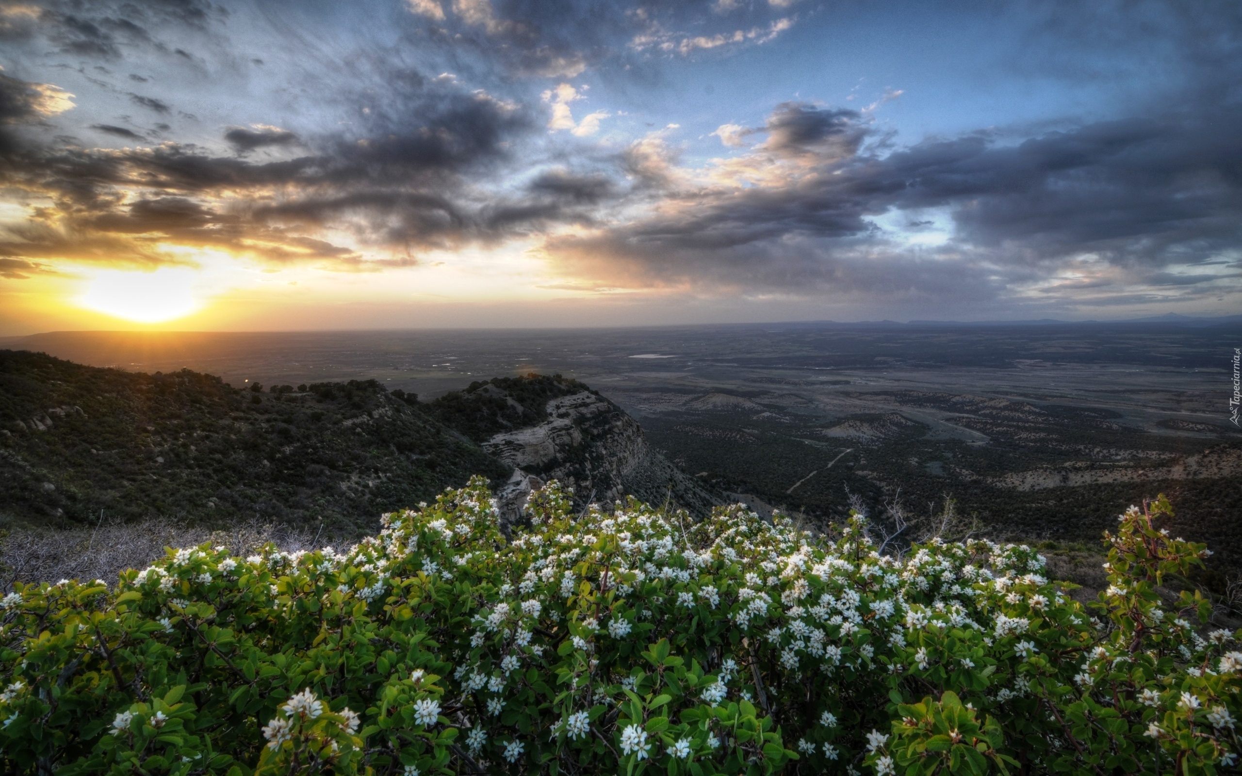 Edytor tapety: Zachód, Słońca, Chmury, Góry, Kwiaty