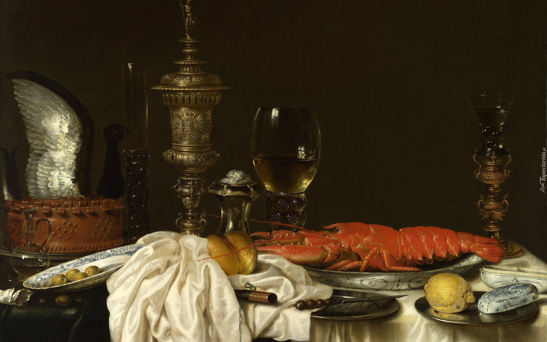 Edytor tapety: Kompozycja, Dzban, Kieliszek, Homar, Bułka, Cytryna, Oliwki, Jedzenie