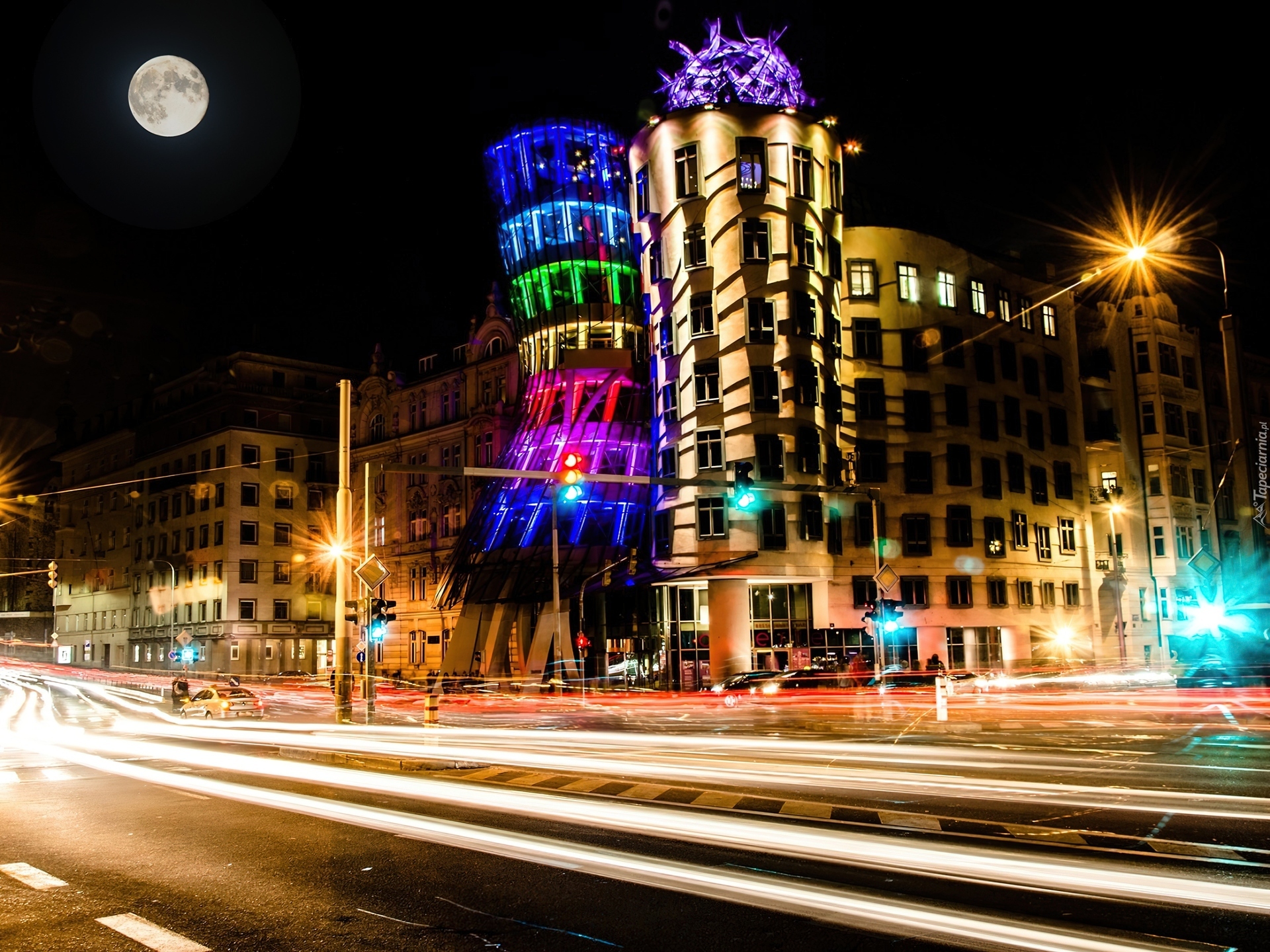 Edytor tapety: Praga, Czechy, Tańczący dom, Oświetlone, Domy, Ulica, Miasto nocą