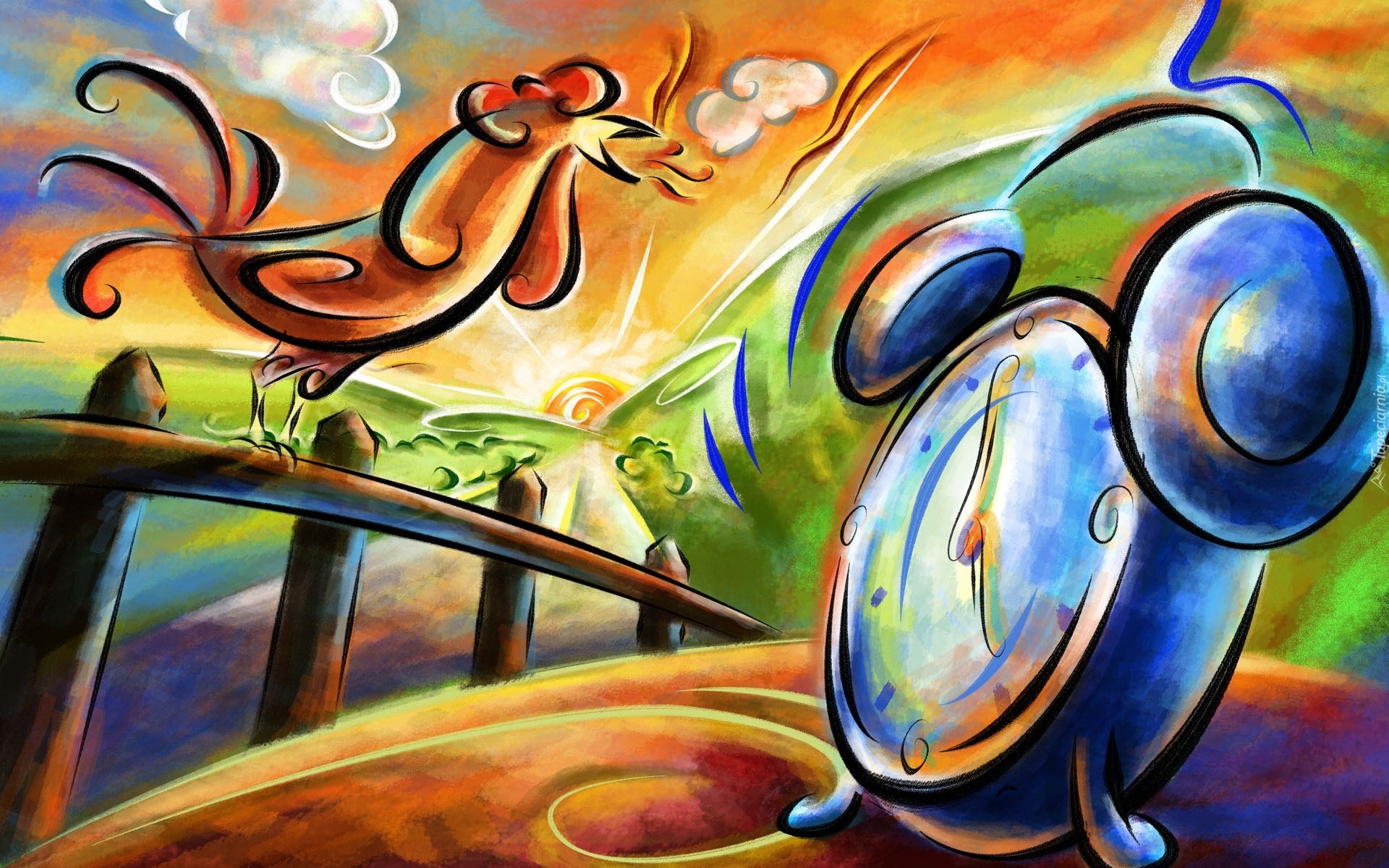 Edytor tapety: Malarstwo, Obraz, Kogut, Budzik, Wschód, Słońca
