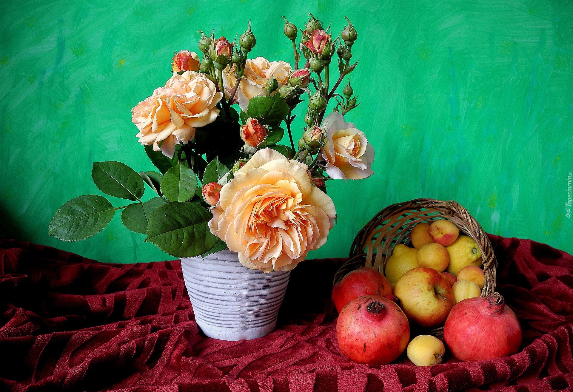 Edytor tapety: Bukiet, Róże, Wazonik, Granaty, Jabłka, Koszyk, Kompozycja