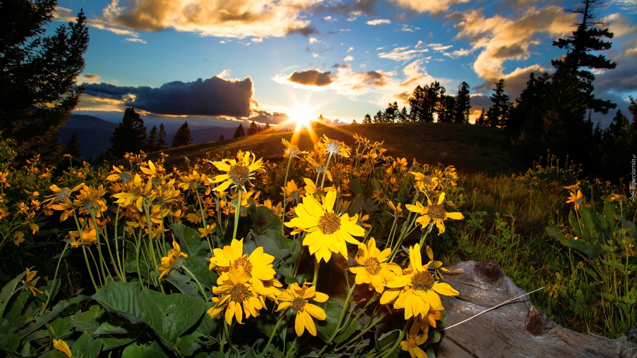Edytor tapety: Zachód Słońca, Wzgórze, Żółte, Kwiaty
