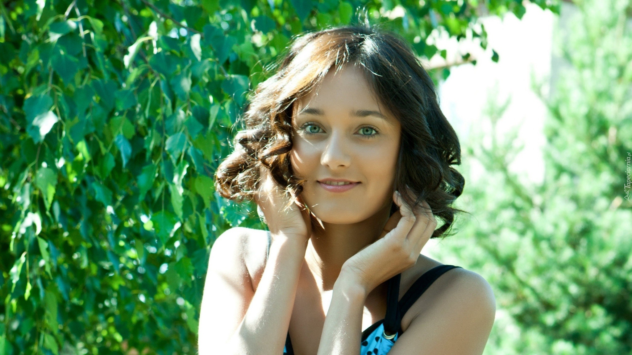 Edytor tapety: Brunetka, Uśmiechnięta, Kobieta, Twarz, Ręce, Zielone, Liście