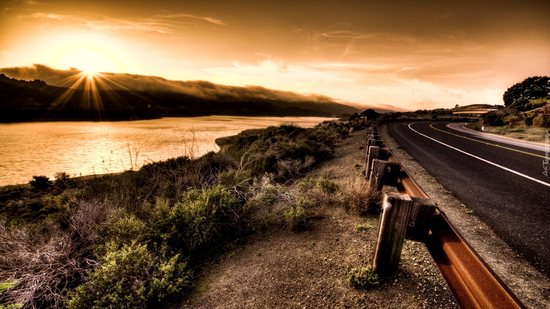 Edytor tapety: Rzeka, Promienie, Słońca, Droga, Barierka
