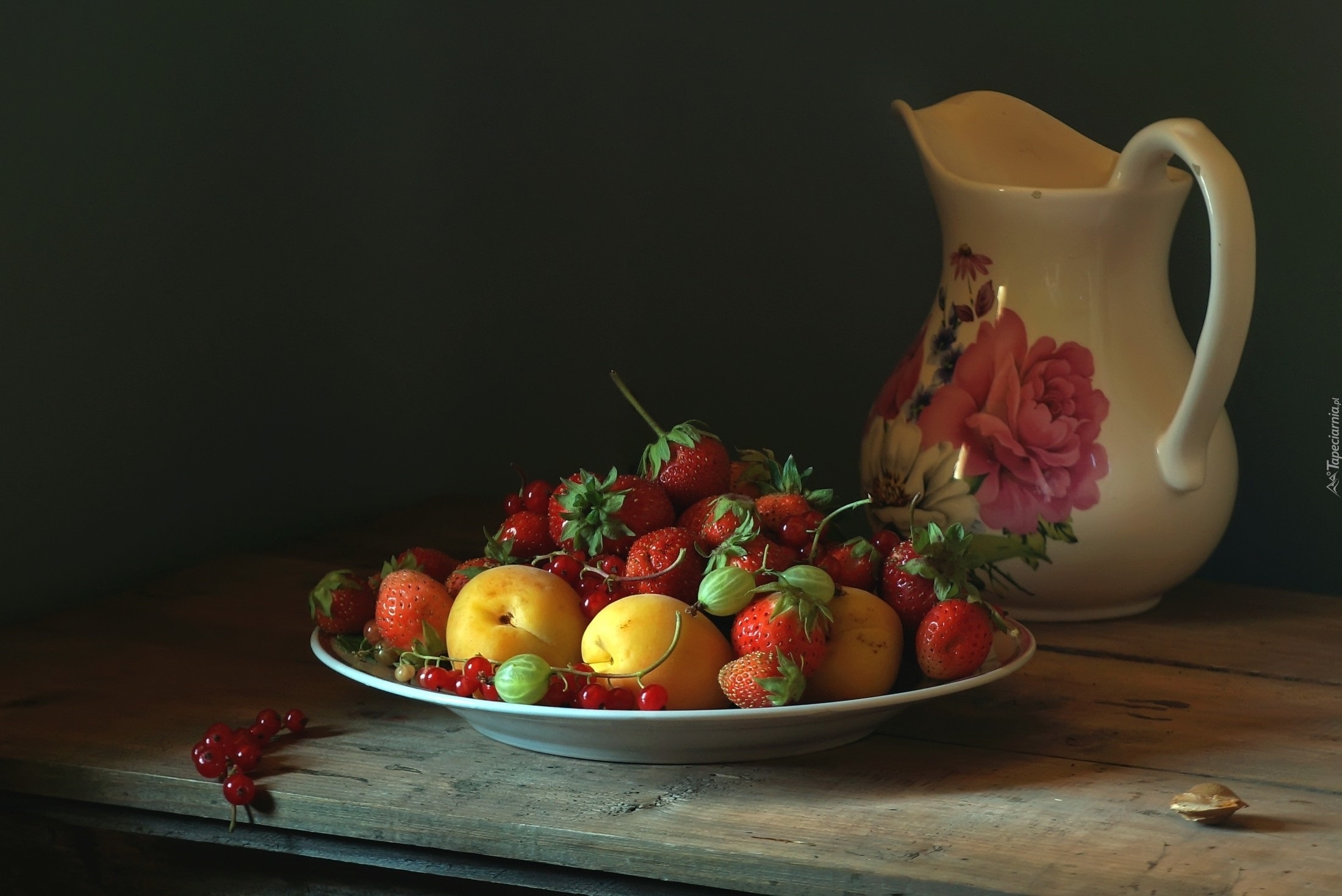 Edytor tapety: Owoce, Truskawki, Morele, Dzban