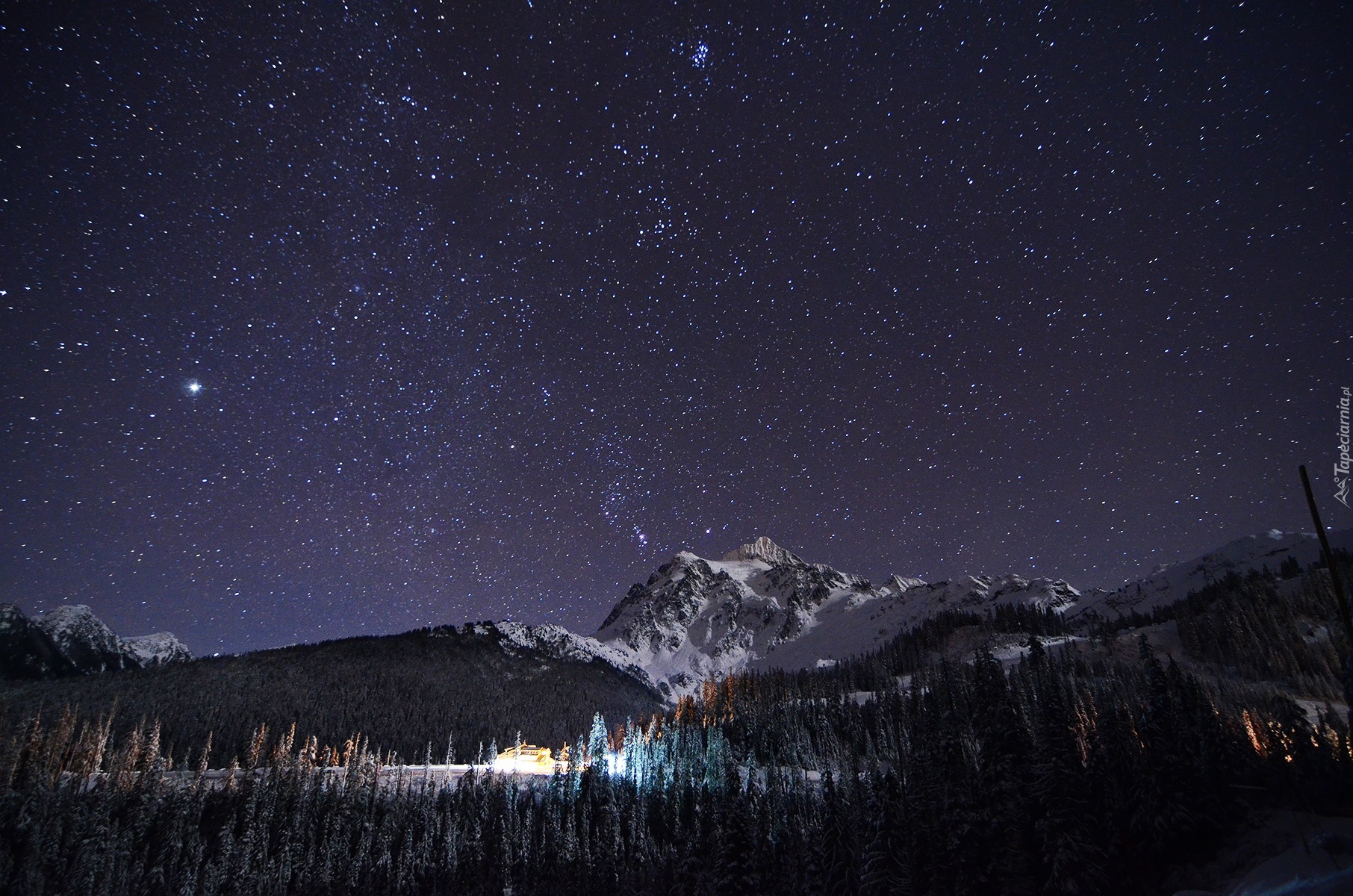 Edytor tapety: Zima, Noc, Niebo, Gory, Las, Snieg