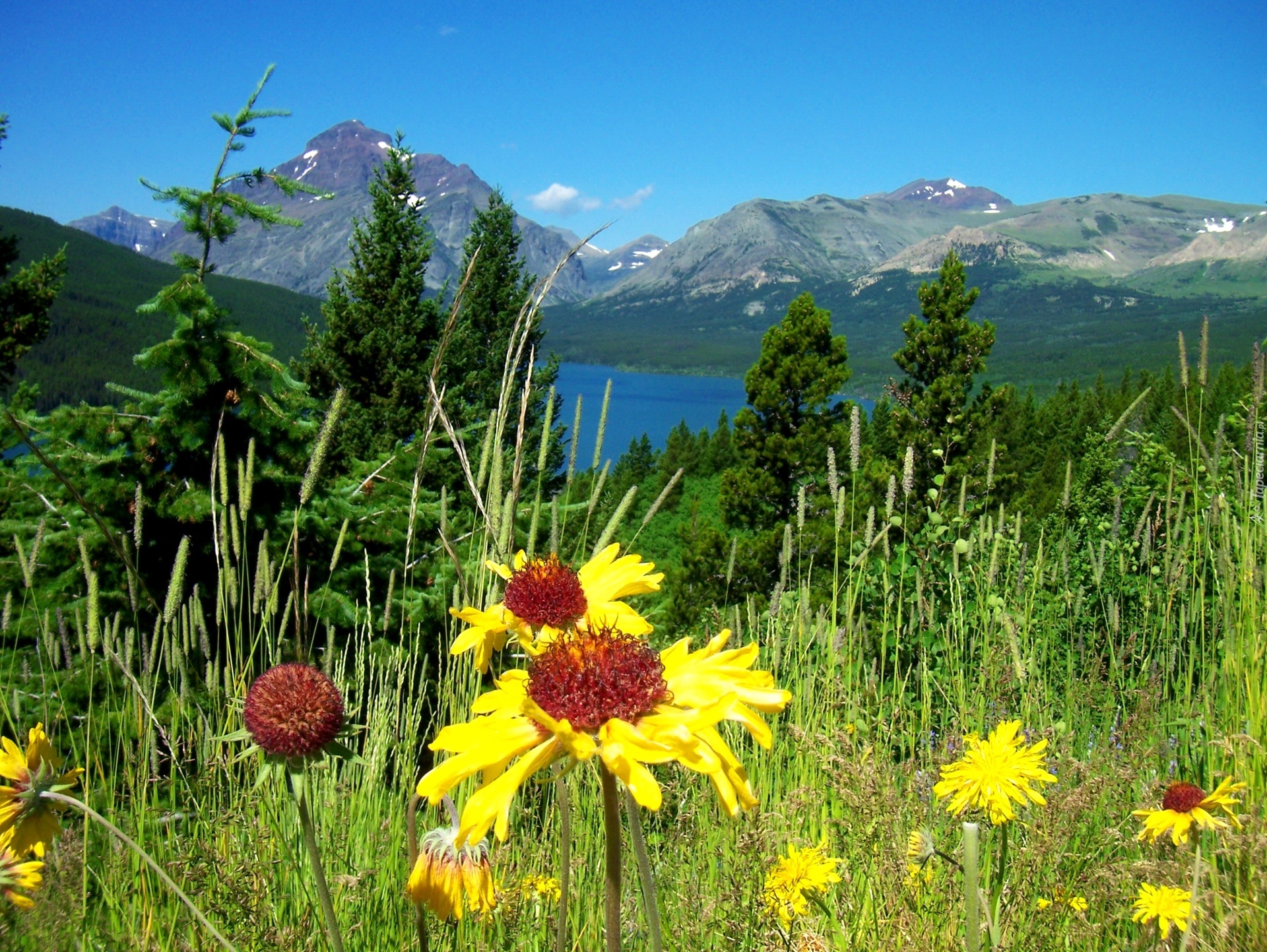 Edytor tapety: Jezioro, Góry, Drzewa, Żółte, Kwiaty