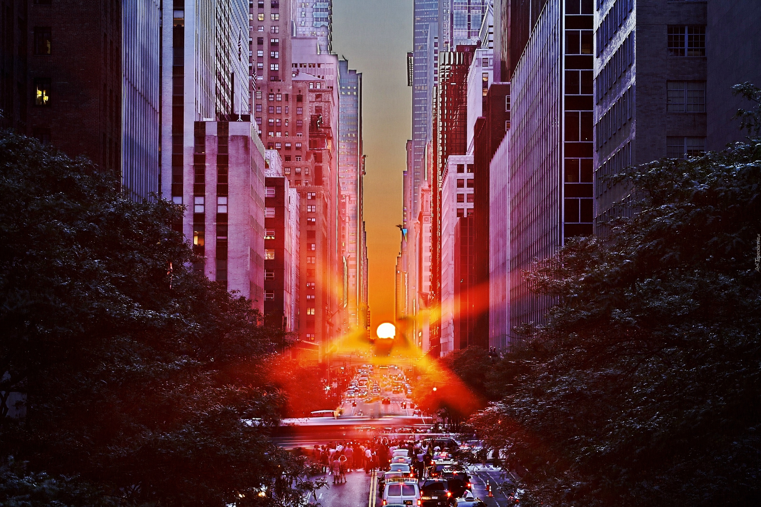 Edytor tapety: Drapacze, Chmur, Manhattan, Zachód, Słońca, Promienie