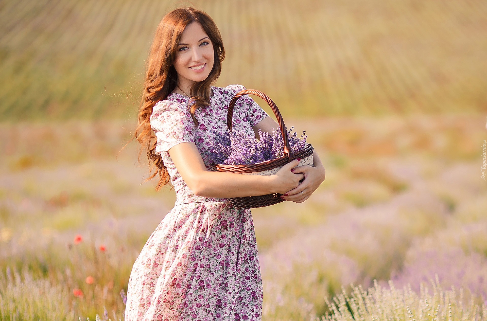 Edytor tapety: Dziewczyna, Brunetka, Łąka, Koszyk, Kosz, Lawenda