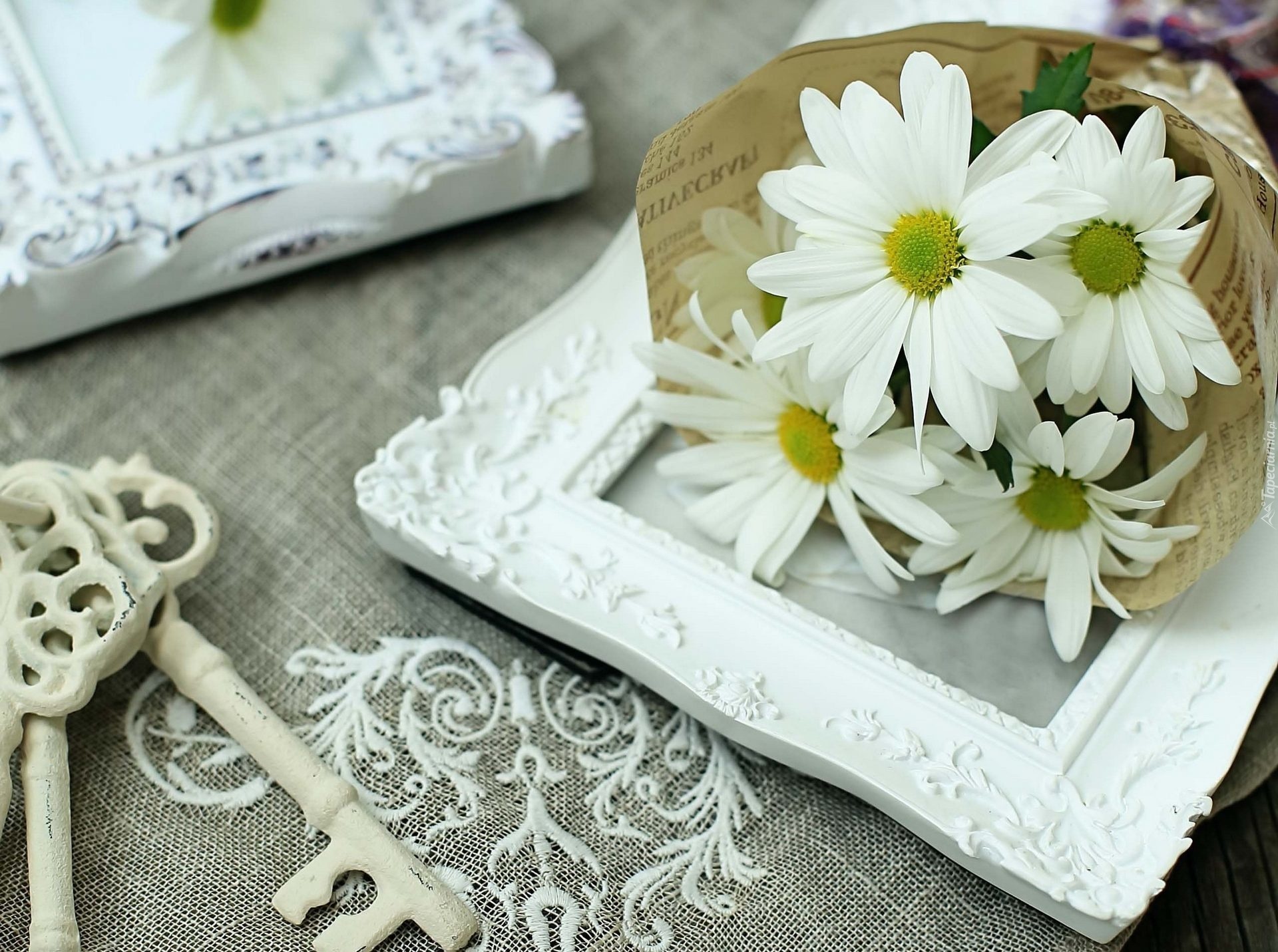 Edytor tapety: Kwiaty, Biale, Margerytki, Ramki, Klucze, Kompozycja