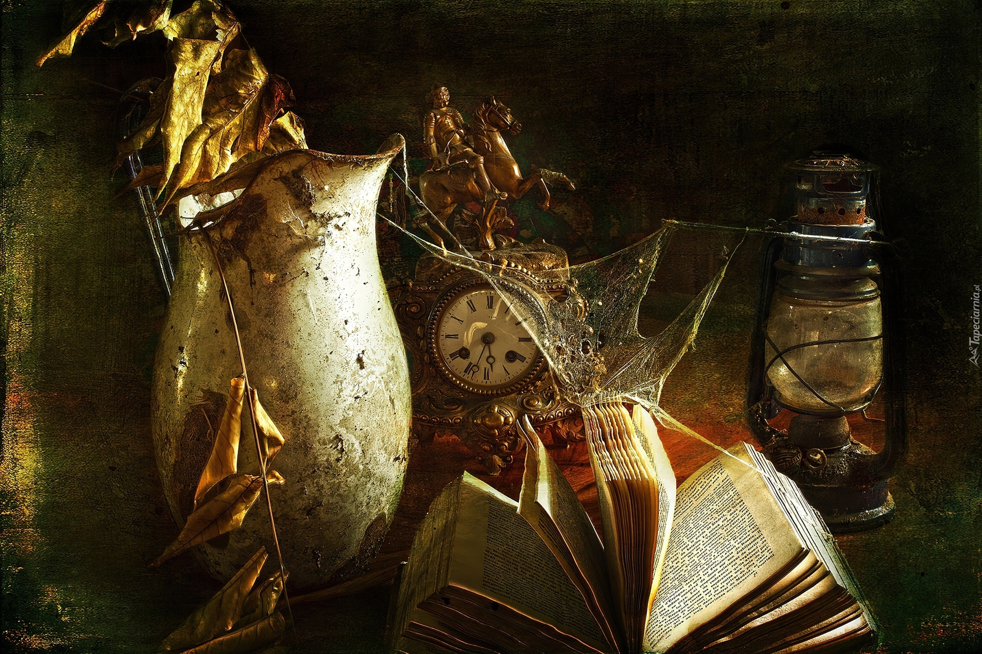 Edytor tapety: Starocie, Pajęczyna, Suche, Liście, Zegar, Książka, Dzban, Lampa