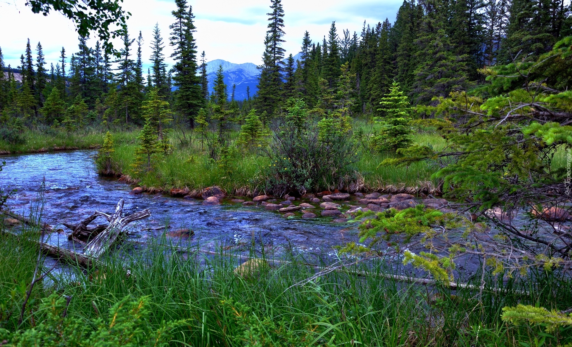 Edytor tapety: Rzeka, Drzewa, Góry, Kamienie