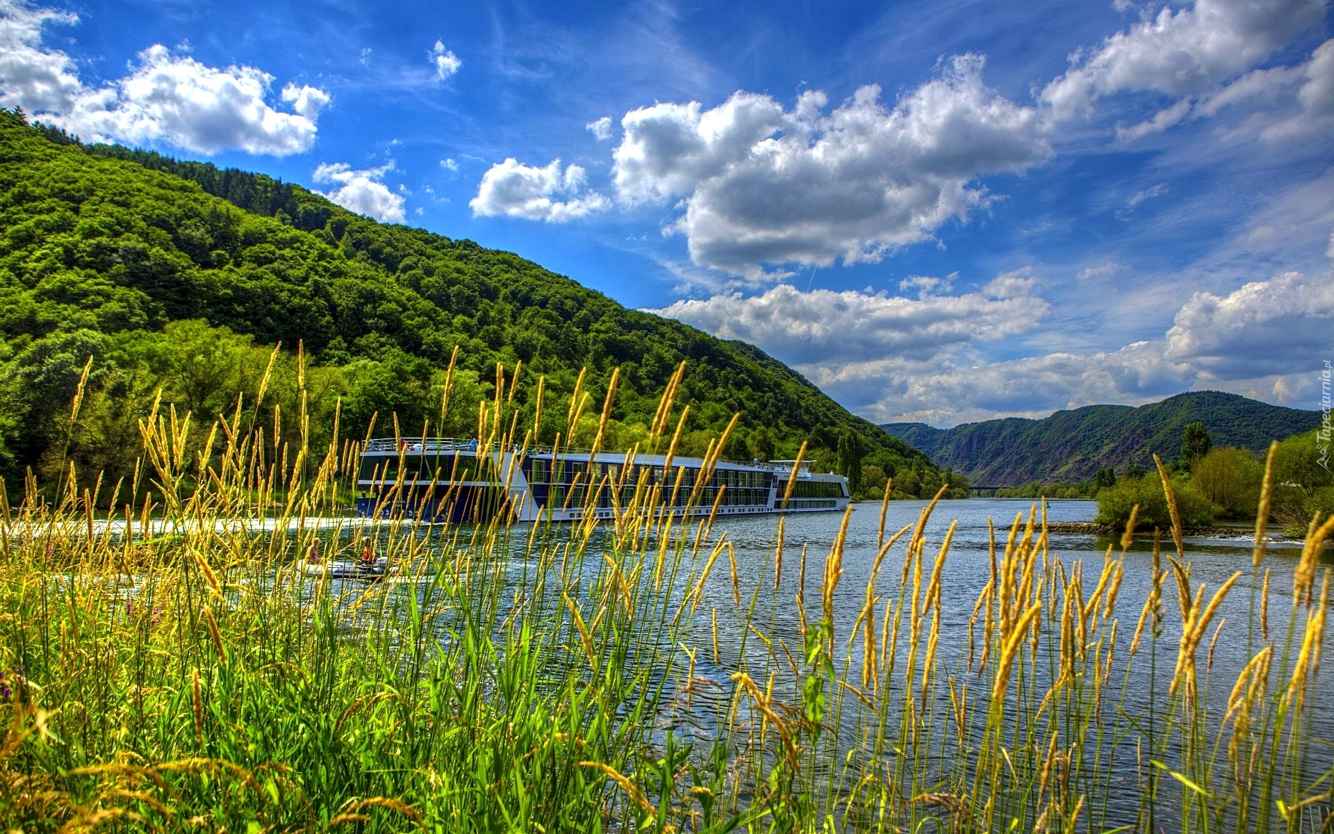 Edytor tapety: Góry, Rzeka, Statek Wycieczkowy, Zarośla, Lato