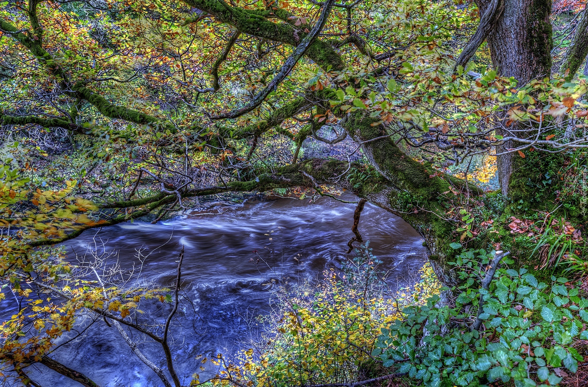 Edytor tapety: Rzeka, Las, Pochylone Drzewo, Jesień