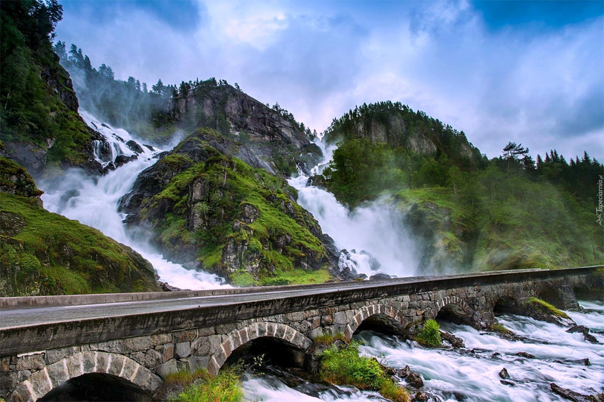 Edytor tapety: Norwegia, Wodospad, Latefossen, Rzeka, Droga, Most