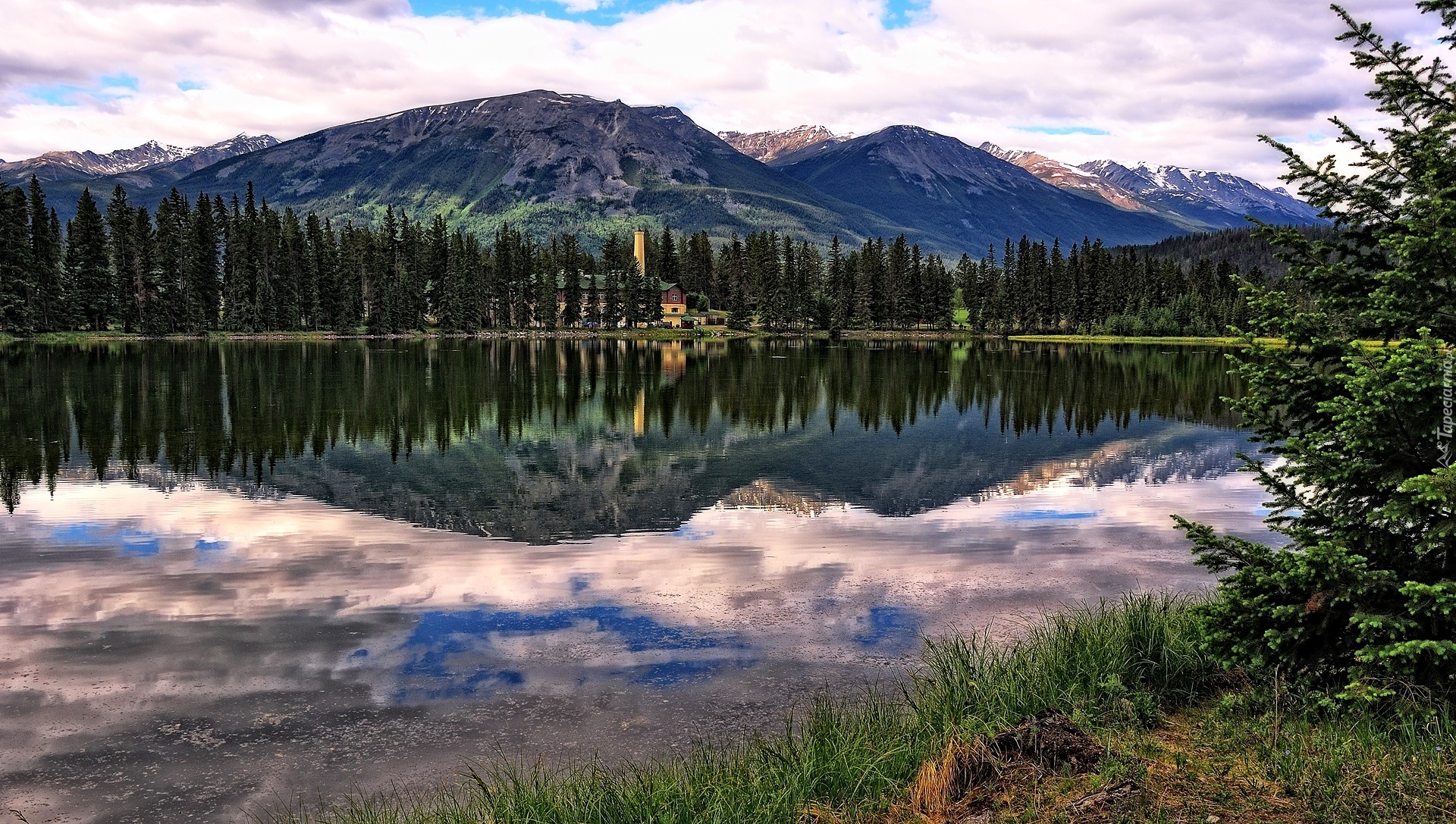 Edytor tapety: Jezioro, Góry, Świerki, Odbicie