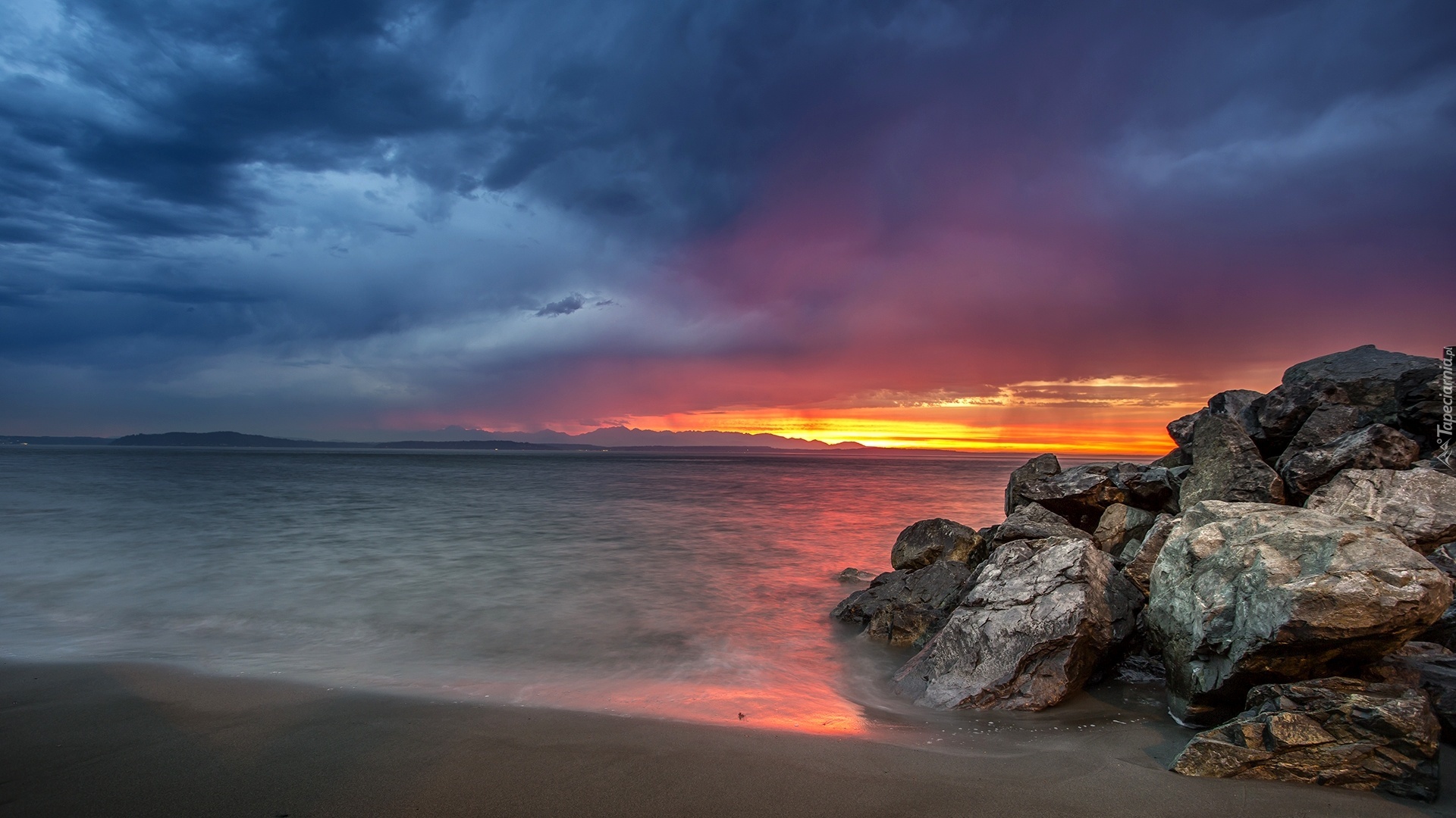 Edytor tapety: Zachód, Słońca, Morze, Skały