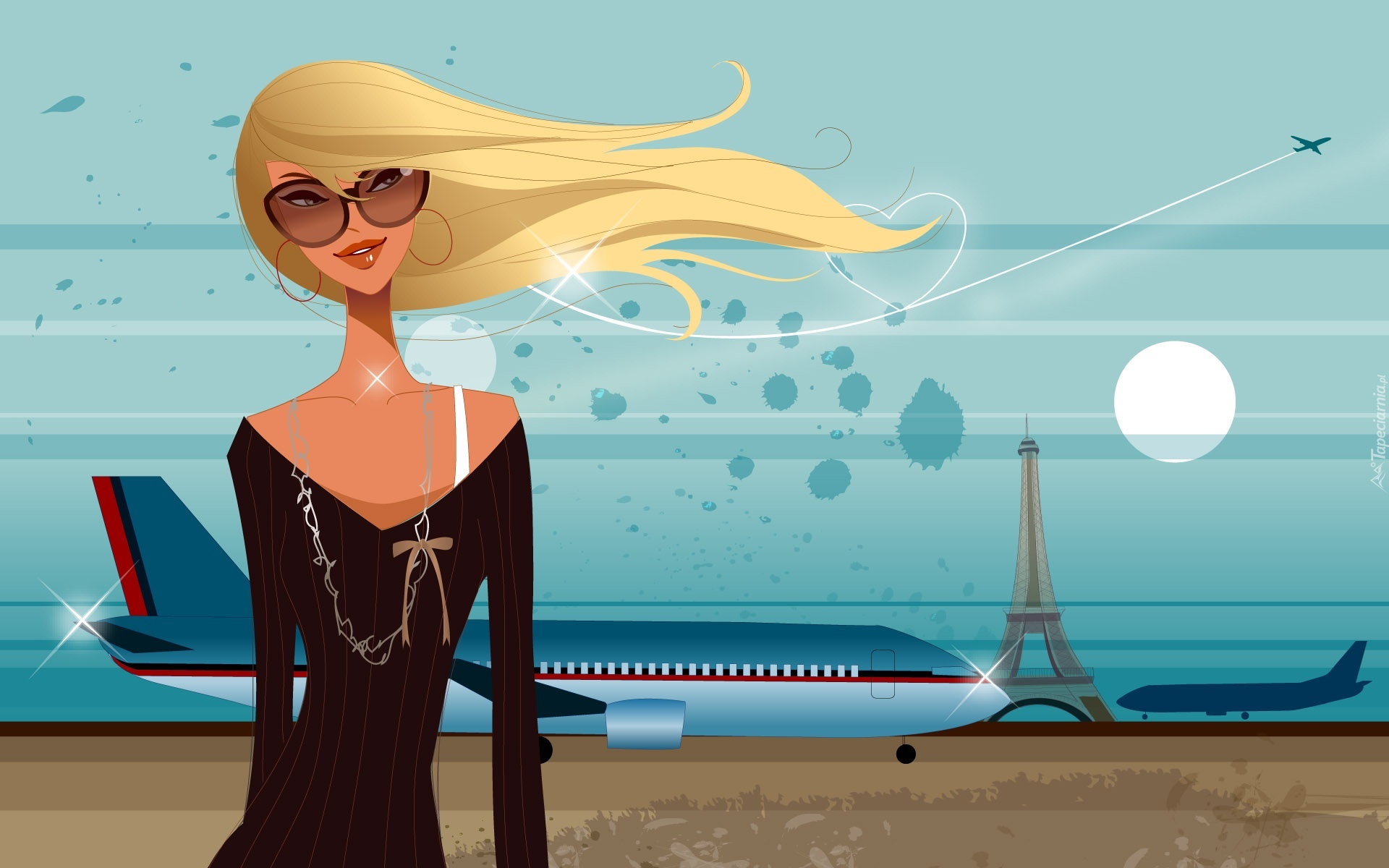 Edytor tapety: Grafika, Blondynka, Moda, Styl, Okulary, Lotnisko, Samolot