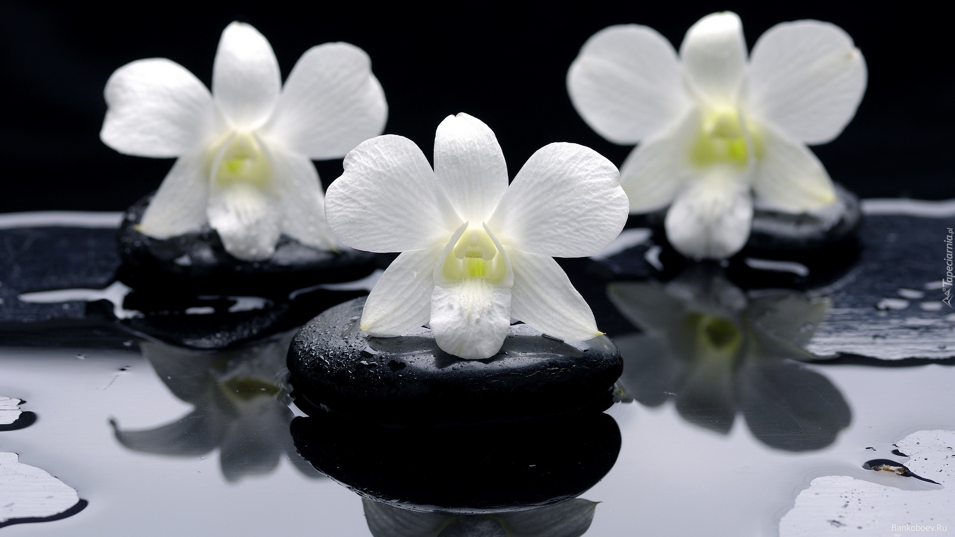 Edytor tapety: Białe, Storczyki, Kamienie, Strumyk