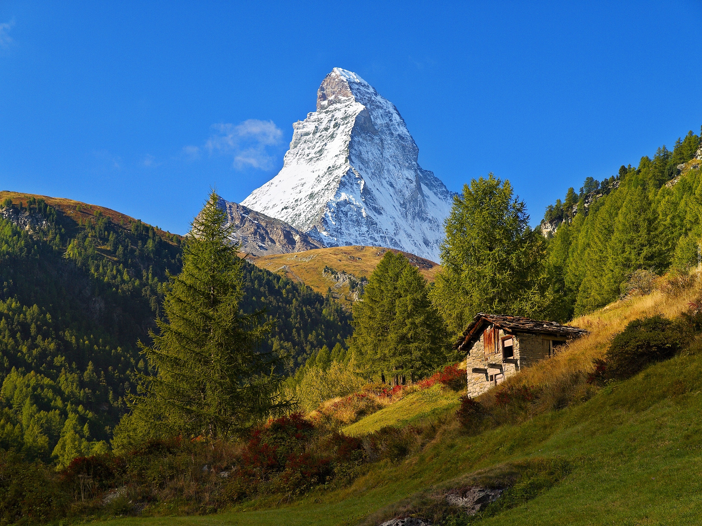 Edytor tapety: Góry, Szczyt, Matterhorn, Las, Łąka, Szopa, Światło, Cień