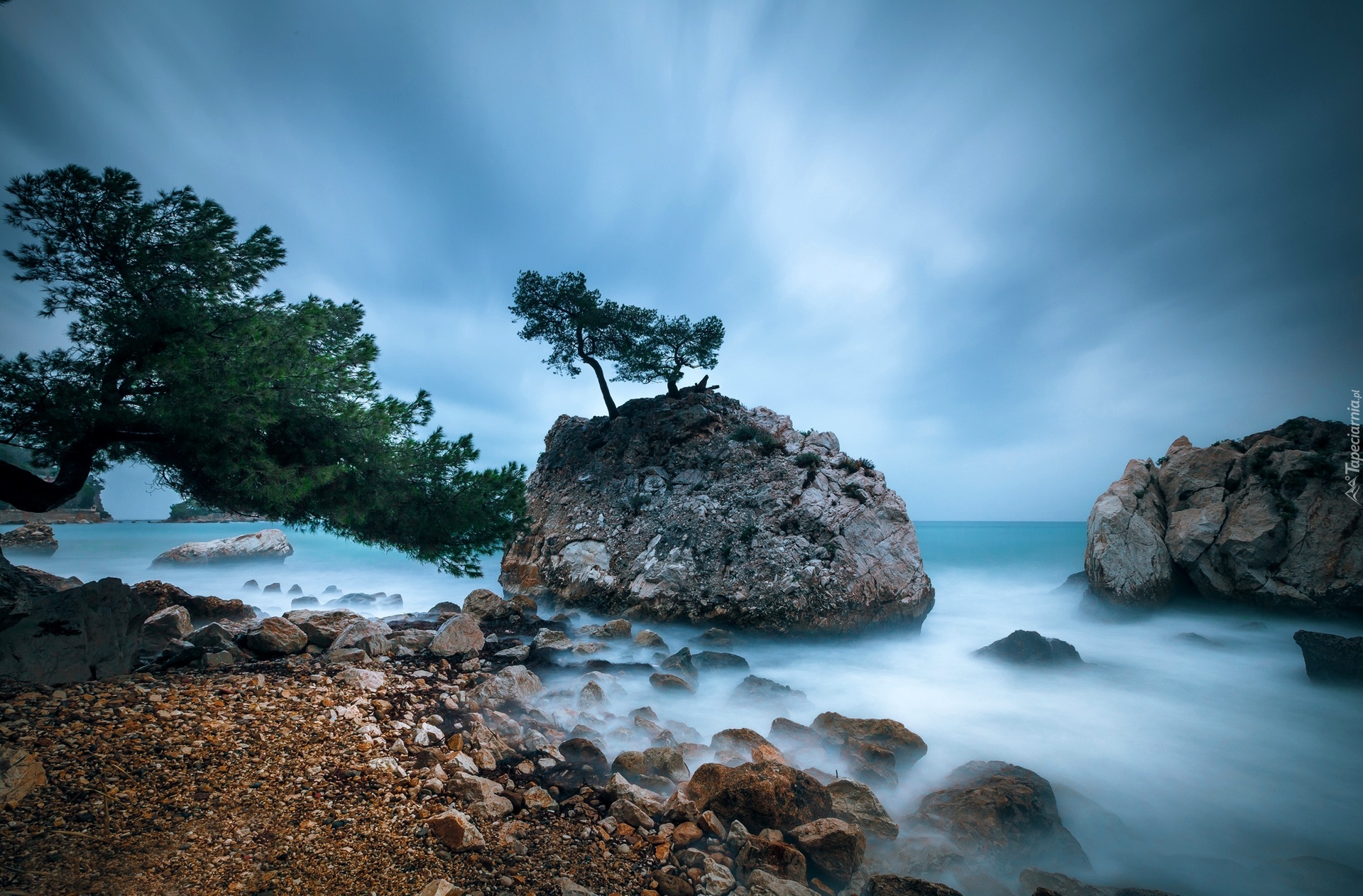 Edytor tapety: Morze, Skały, Kamienie, Drzewa