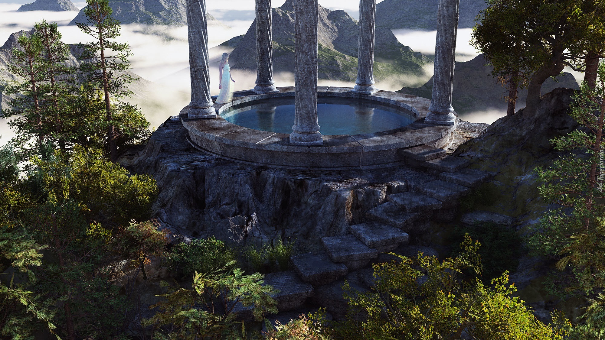 Edytor tapety: Fantasy, Studnia, Dziewczyna, Kolumny, Schody, Kamienie, Mgła, Góry